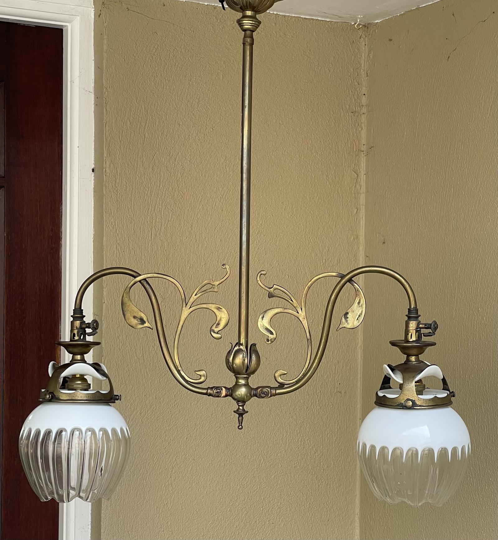 Art Nouveau Brass Hanging Gas Light Chandelier, Converted (1 of 9)