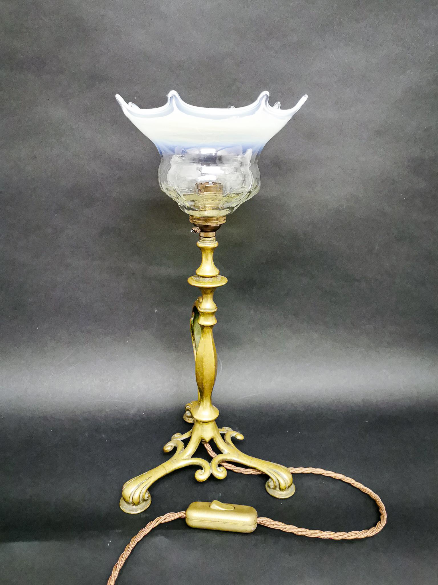 Art Nouveau Brass Lamp with Glass Shade