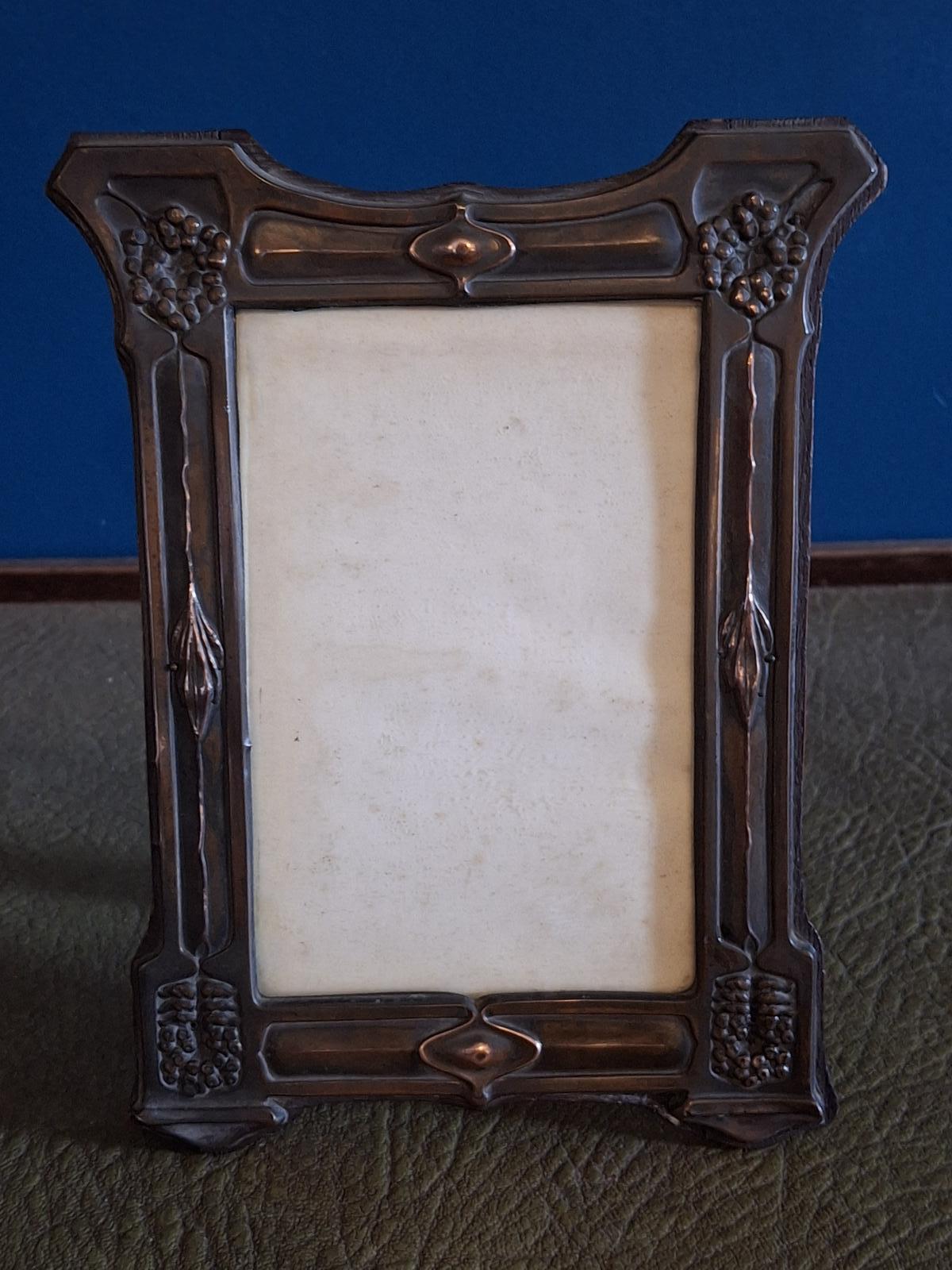 This is an Art Nouveau photograph frame made of copper on wood, dating from approximately 1880 to 1910. The frame features characteristic Art Nouveau design elements, including flowing lines and organic motifs. It is suitable for displaying photographs and is constructed from wood, with a repousse copper overlay. It is in lovely original condition and measures 21 x15 cms