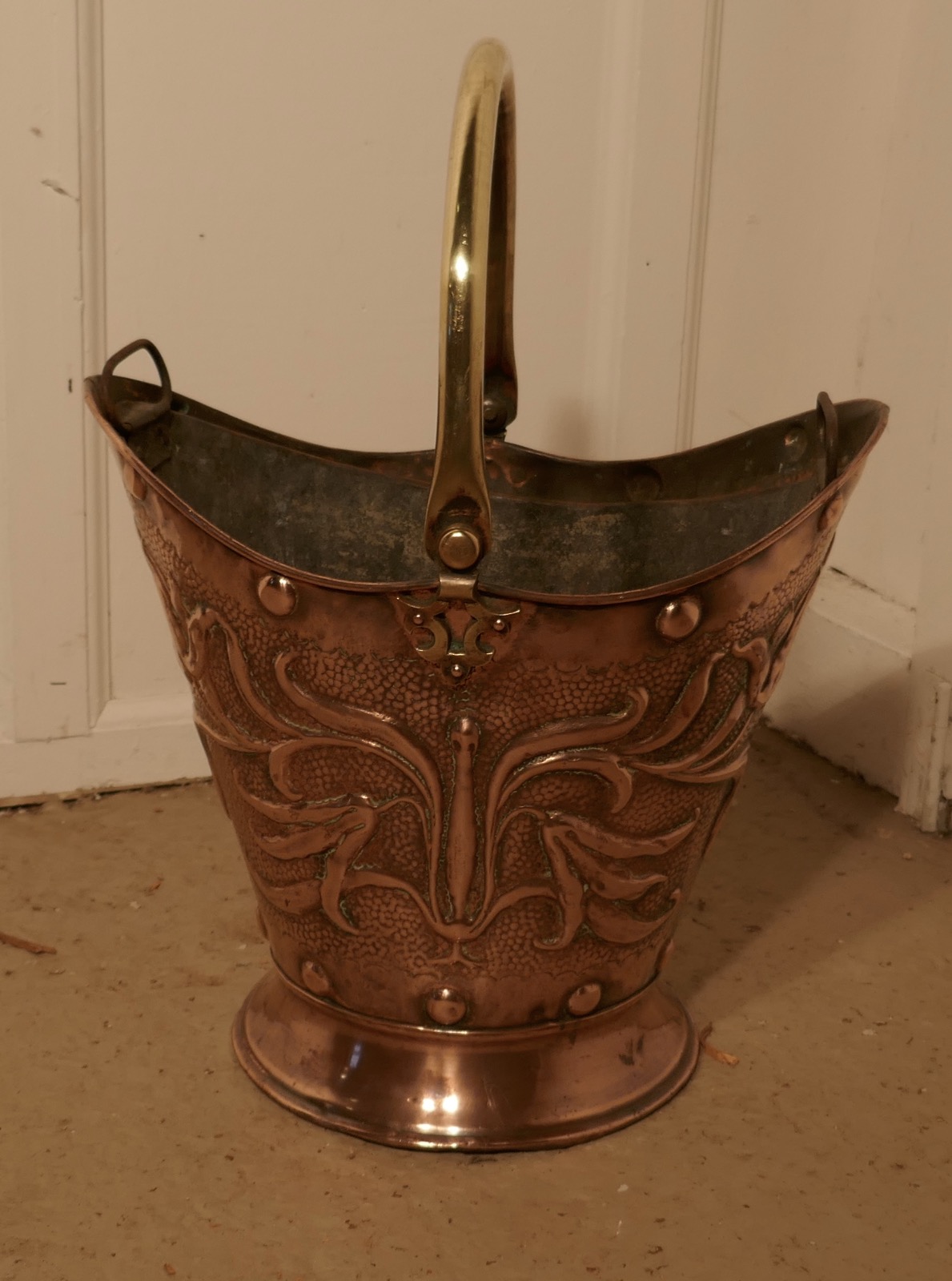 Art Nouveau Embossed Copper Helmet Coal Scuttle with Liner c.1890
