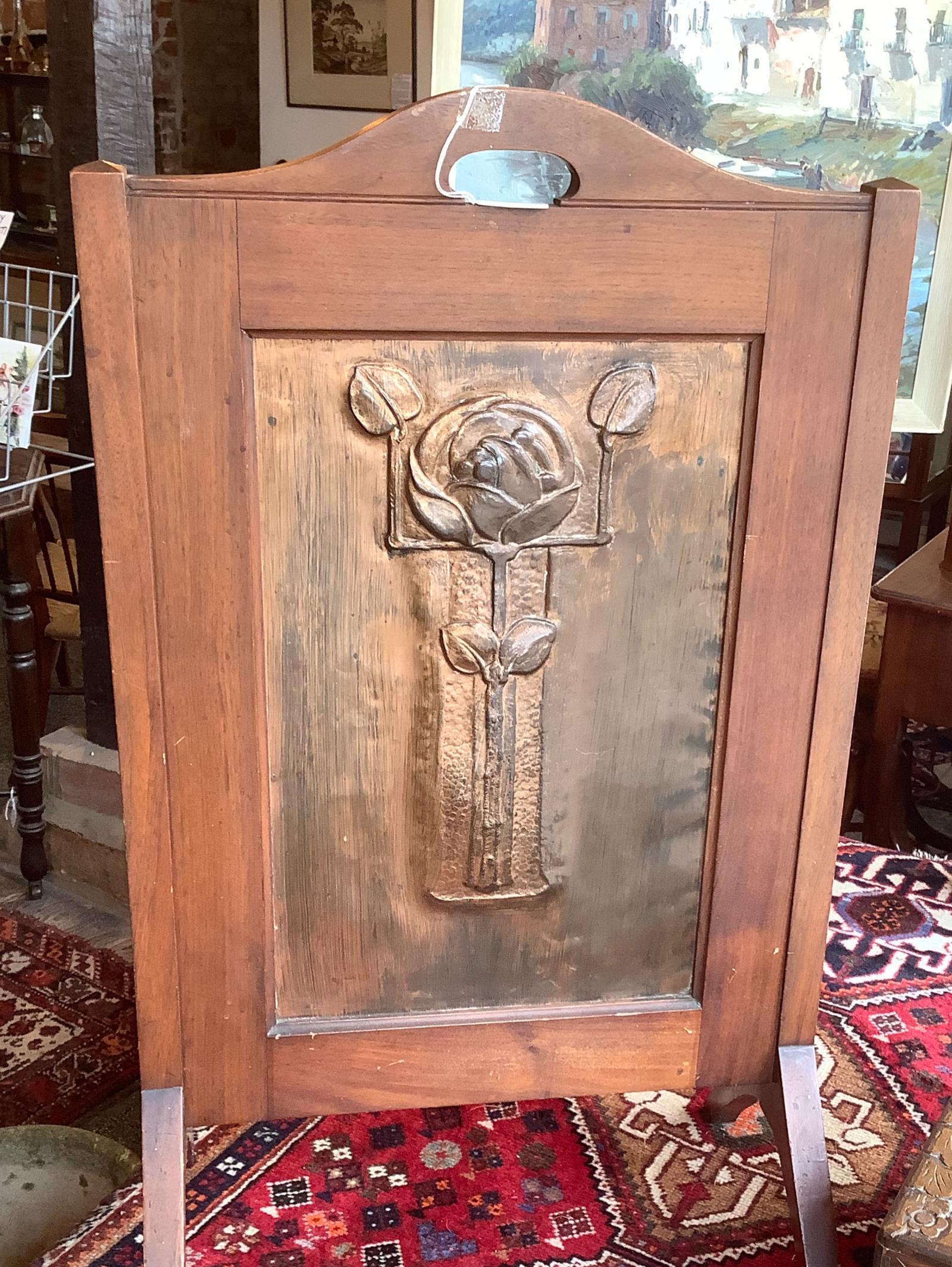 A very attractive Art Nouveau fire screen in mahogany with copper panel featuring a Mackintosh style rose.
