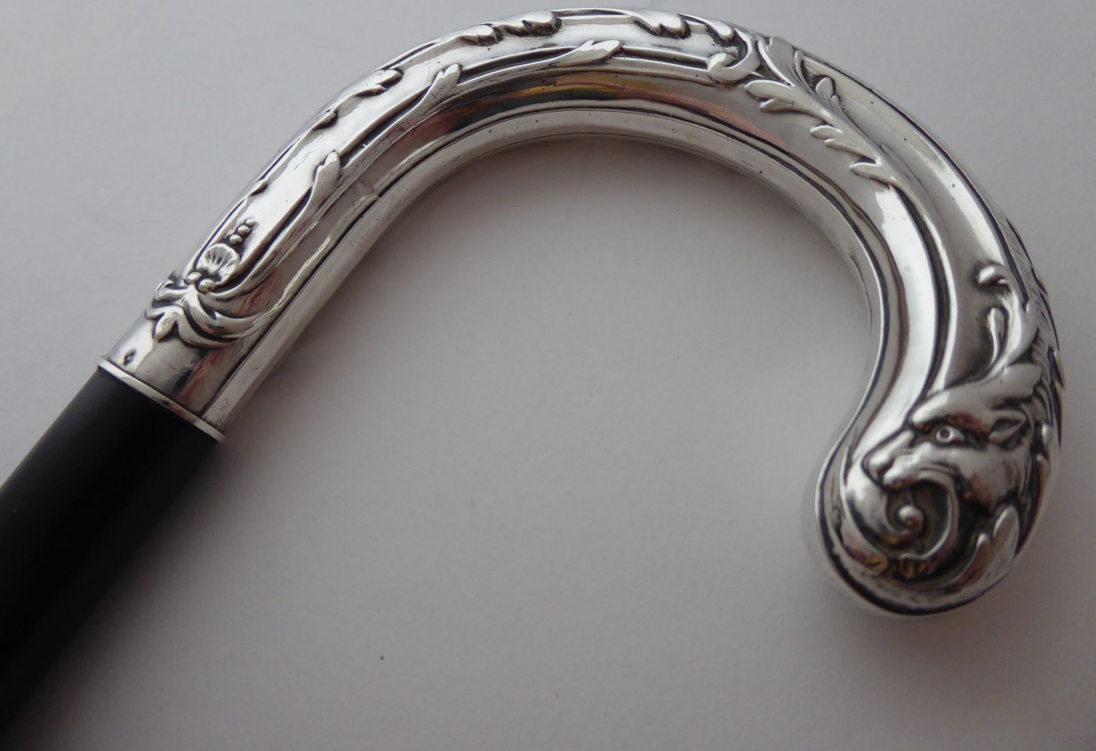 Art Nouveau French Walking Stick Cane Solid Silver Pommel Ebonised Wood Shaft