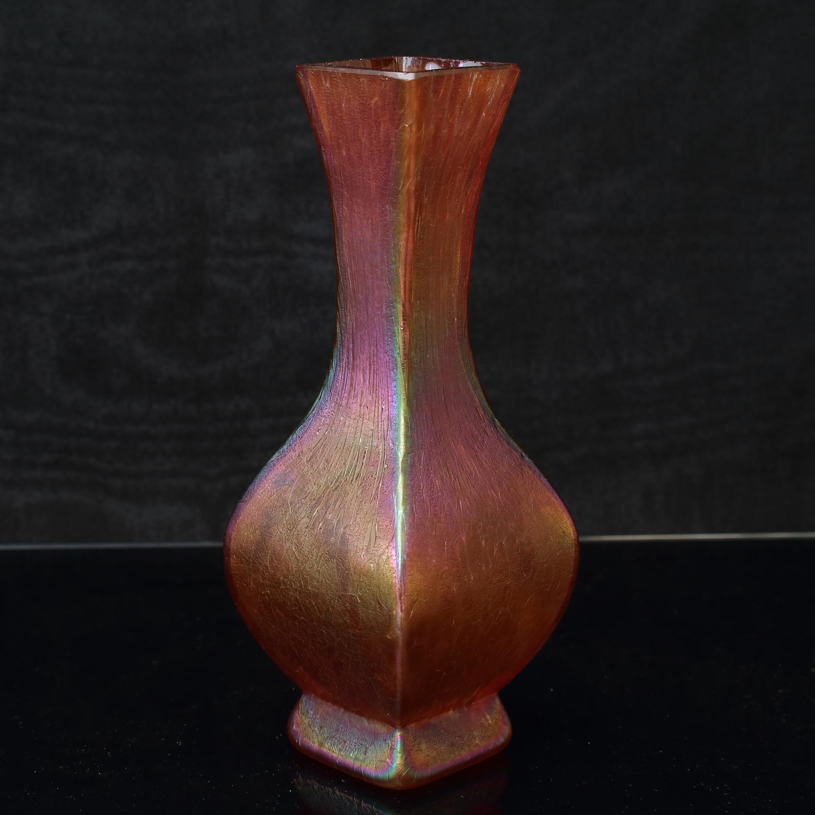 This exquisite antique vase boasts a peach coloured glass with stunning iridescent finish known as Oil Spot. Exceptional example of a handmade Bohemian glass, probably by Kralik judging by the oil spot pattern although the shape very much resembles the popular Baccarat Lotus shape. This decorative vase is certainly a scarce example from the Art Nouveau period, and a wonderful addition to any collection.
