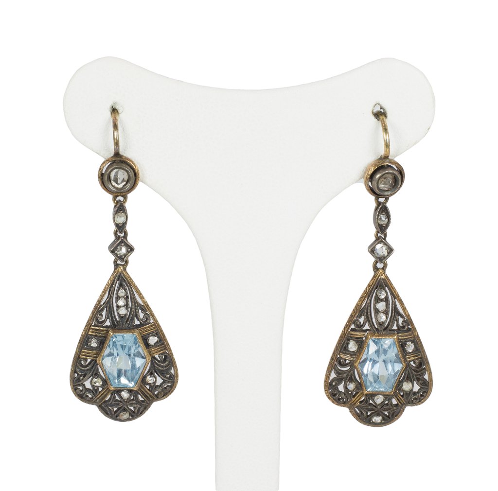 Art Nouveau Gold, Aquamarine, Diamond & Silver Earrings