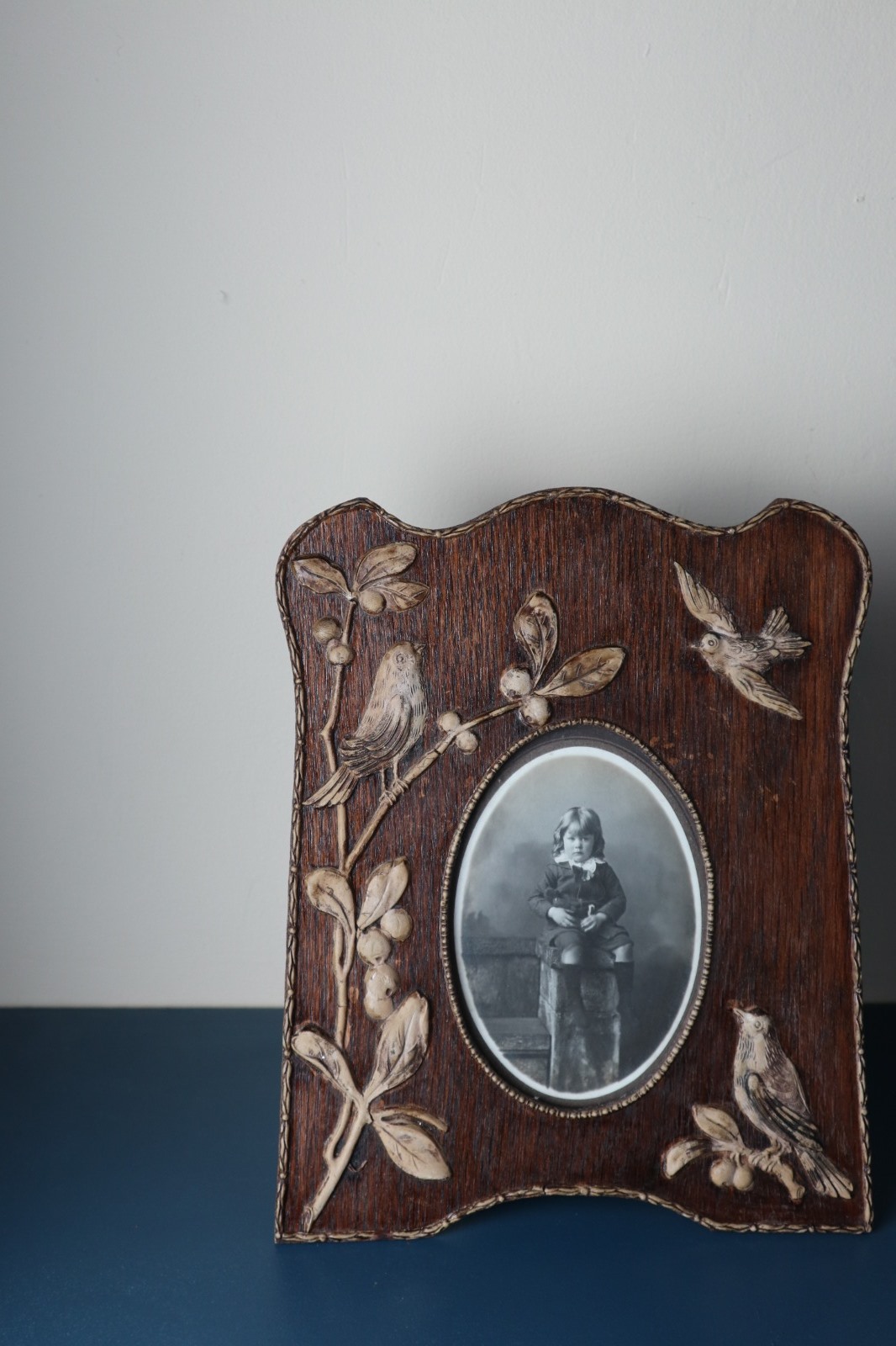 Art Nouveau / Jugendstil, Edwardian Period, Oval Portrait Photograph Frame. Oak & Raised Plaster (Depicting Song Birds, Leaves & Berries) c.1905 (1 of 15)