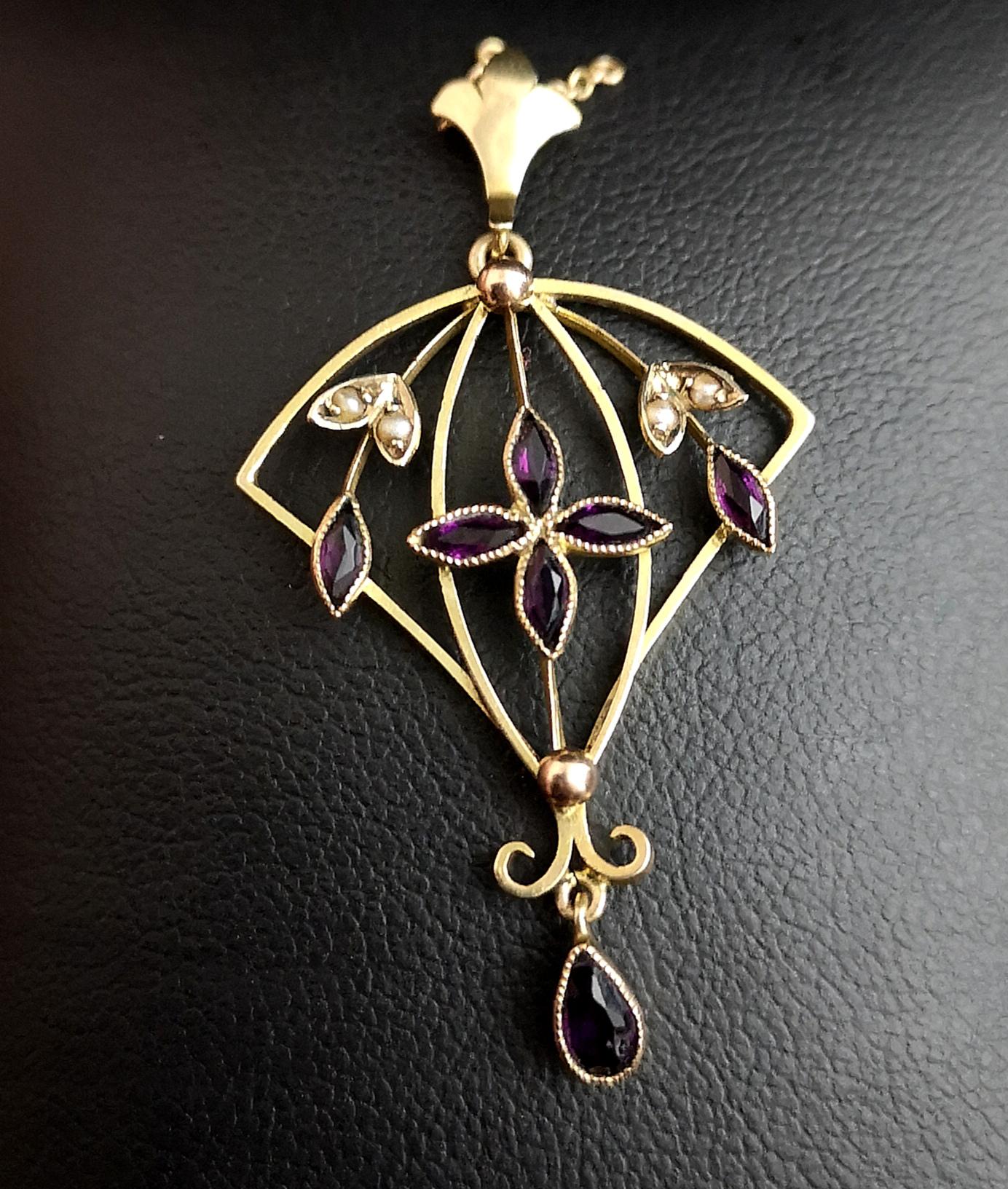 Art Nouveau Lavalier Pendant, 9ct Gold, Amethyst & Seed Pearl
