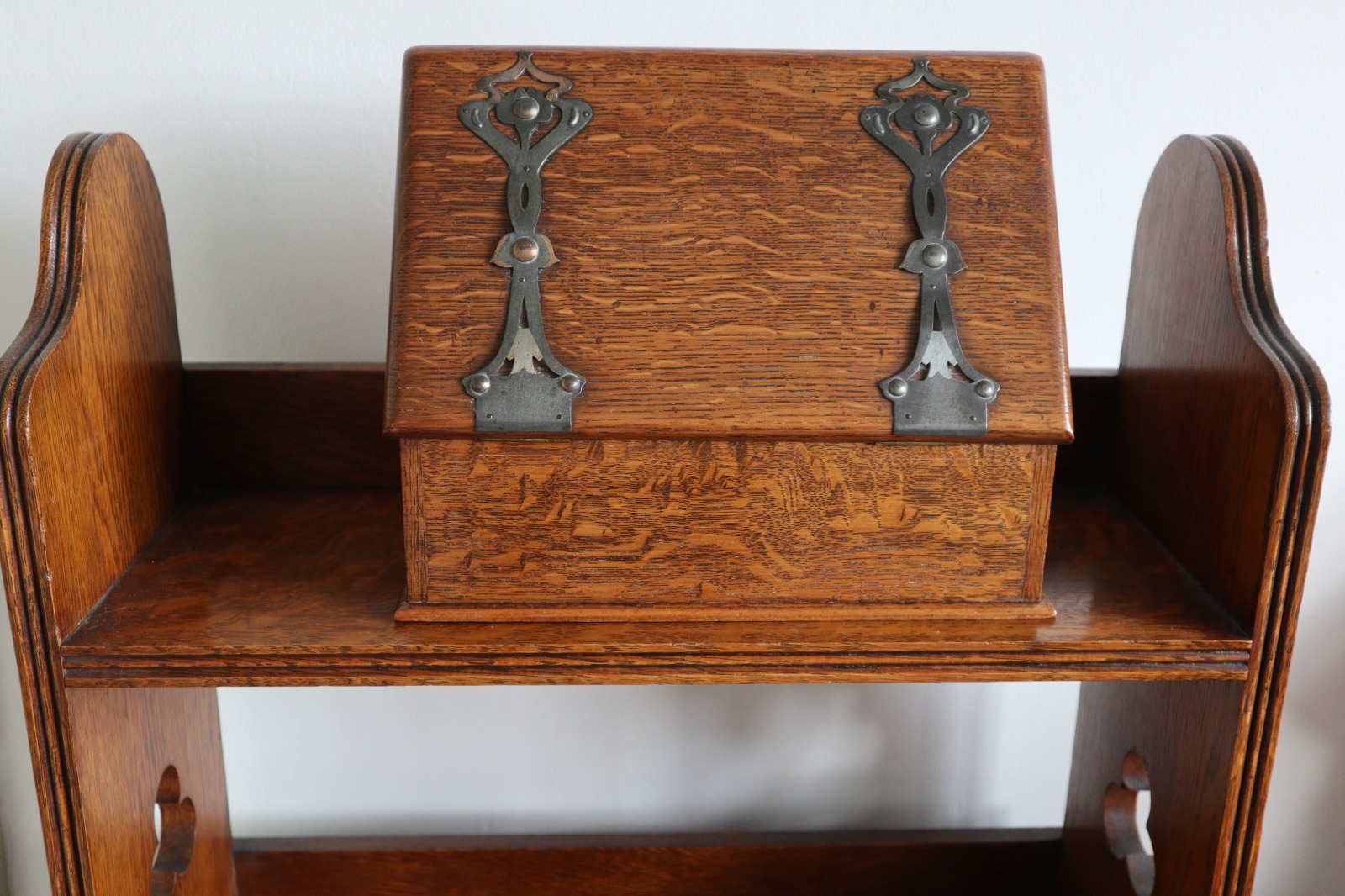 Art Nouveau Light Oak Stationary Box / Letter Writing Slope with Floral Stylised Metal Strapwork C.1900
