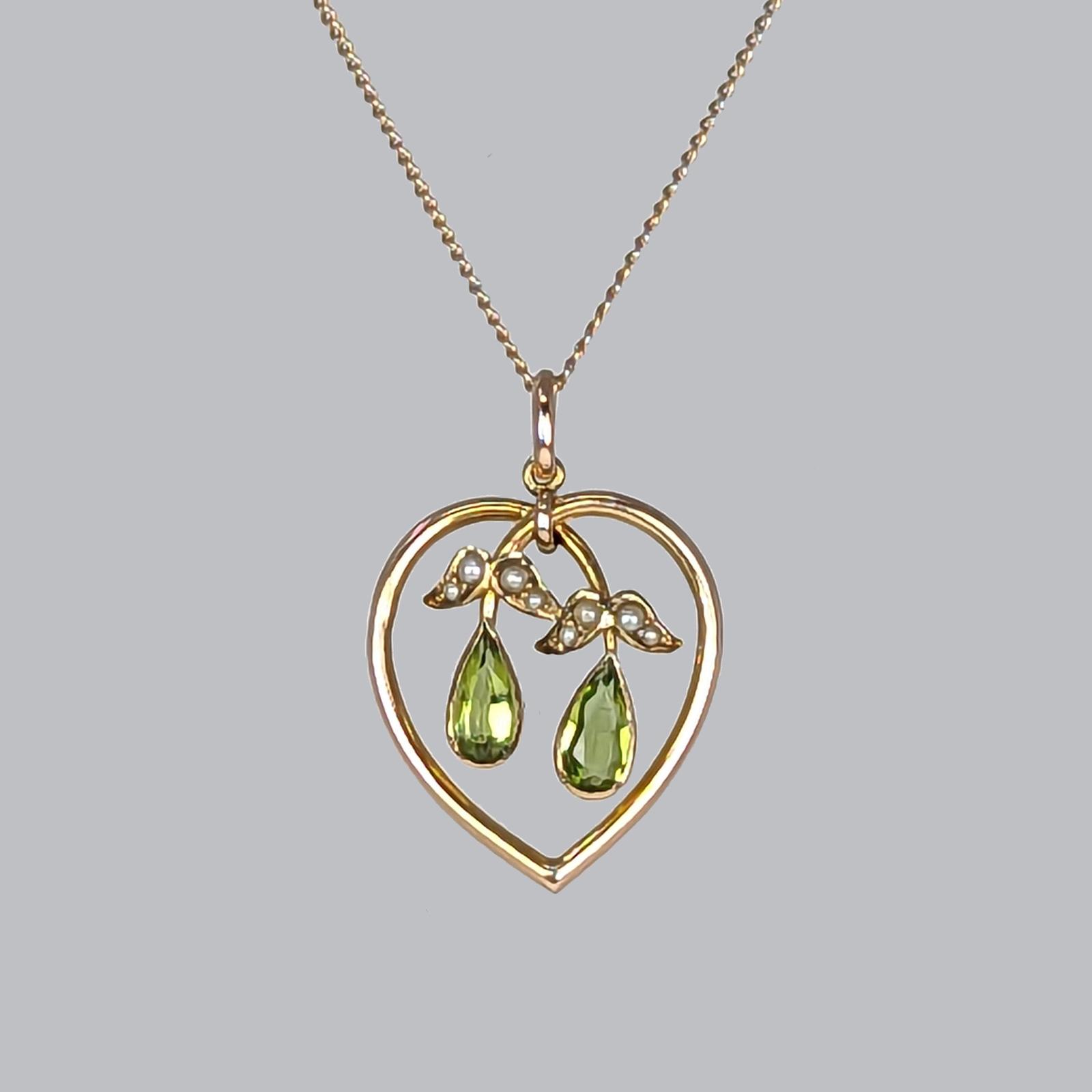 Art Nouveau Pendant Peridot and Pearl 9ct Gold Floral Antique Edwardian Pendant (1 of 6)