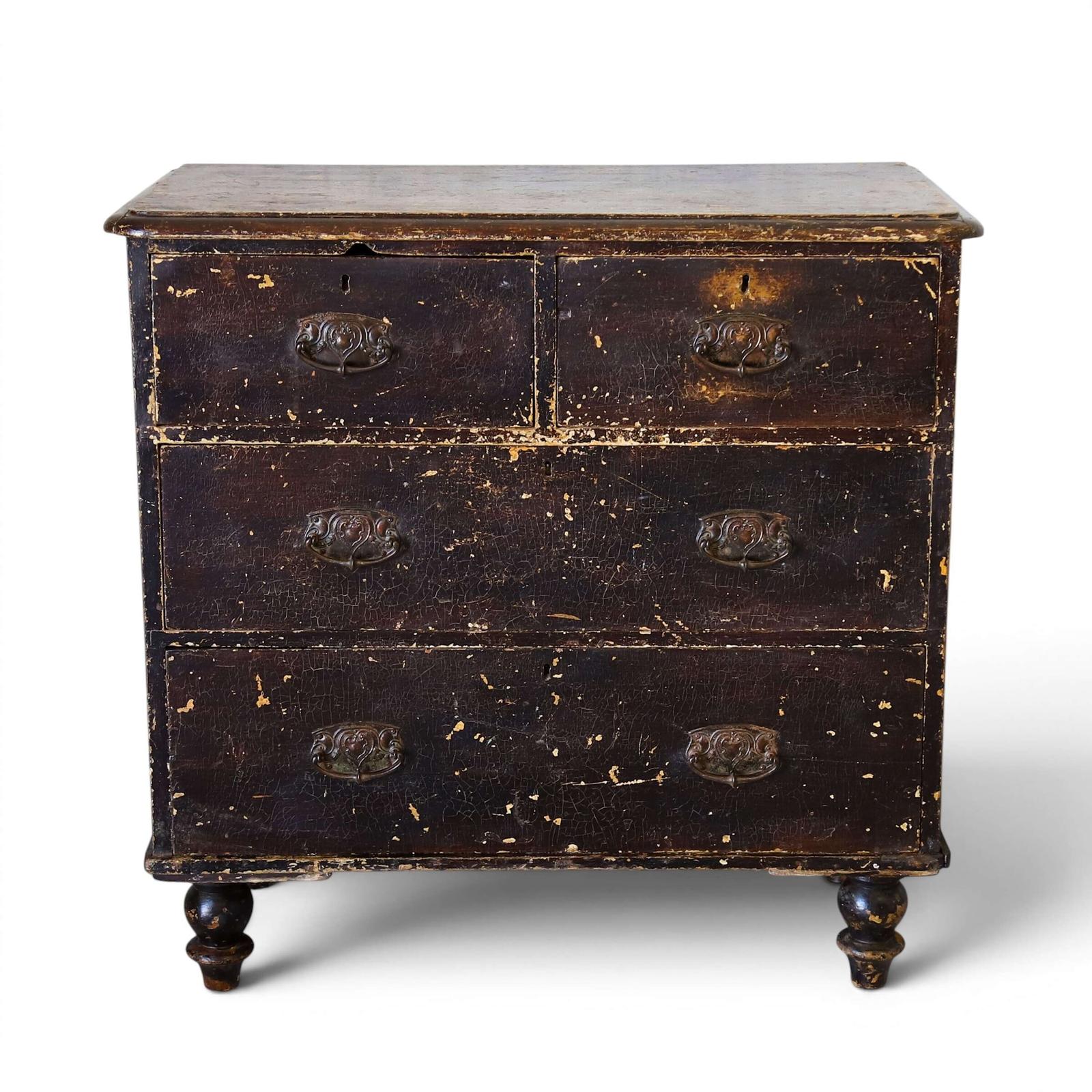 This small, modest chest of drawers is a wonderful example of early 20th‑century English utilitarian furniture. Made from pine and finished in a brown scumble glaze, it has developed a beautifully aged patina over time. The original paint has softened, worn, and chipped in places, giving the surface a deep, tactile richness.