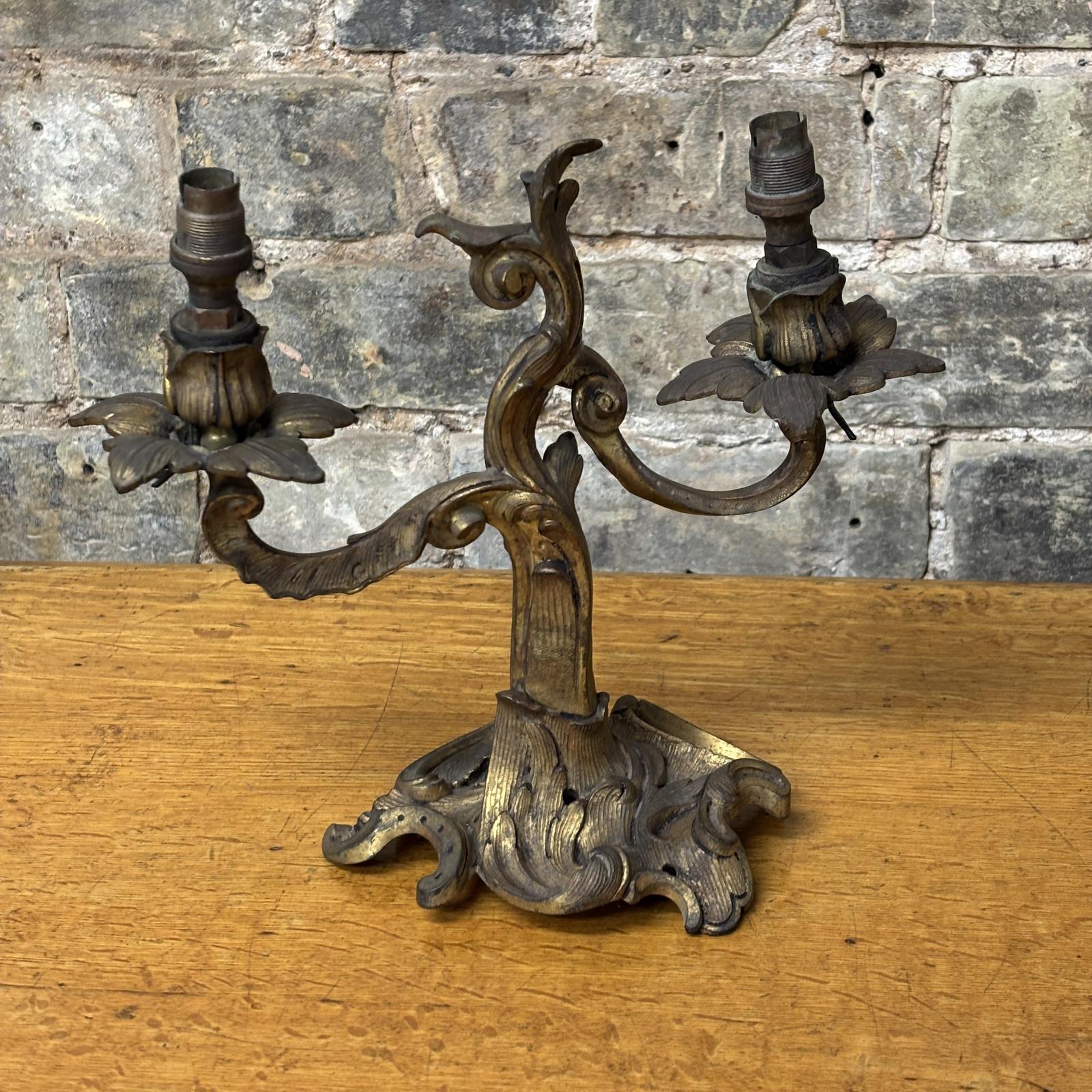 Cast in bronze with its original gilt-style finish, the piece has a really decorative, almost Art Nouveau feel, with flowing scroll arms and floral detailing throughout. The surface has a lightly textured, almost hammered look, which helps catch the light nicely, with the original gilt tones coming through on the high points, giving it a real sense of depth and warmth.