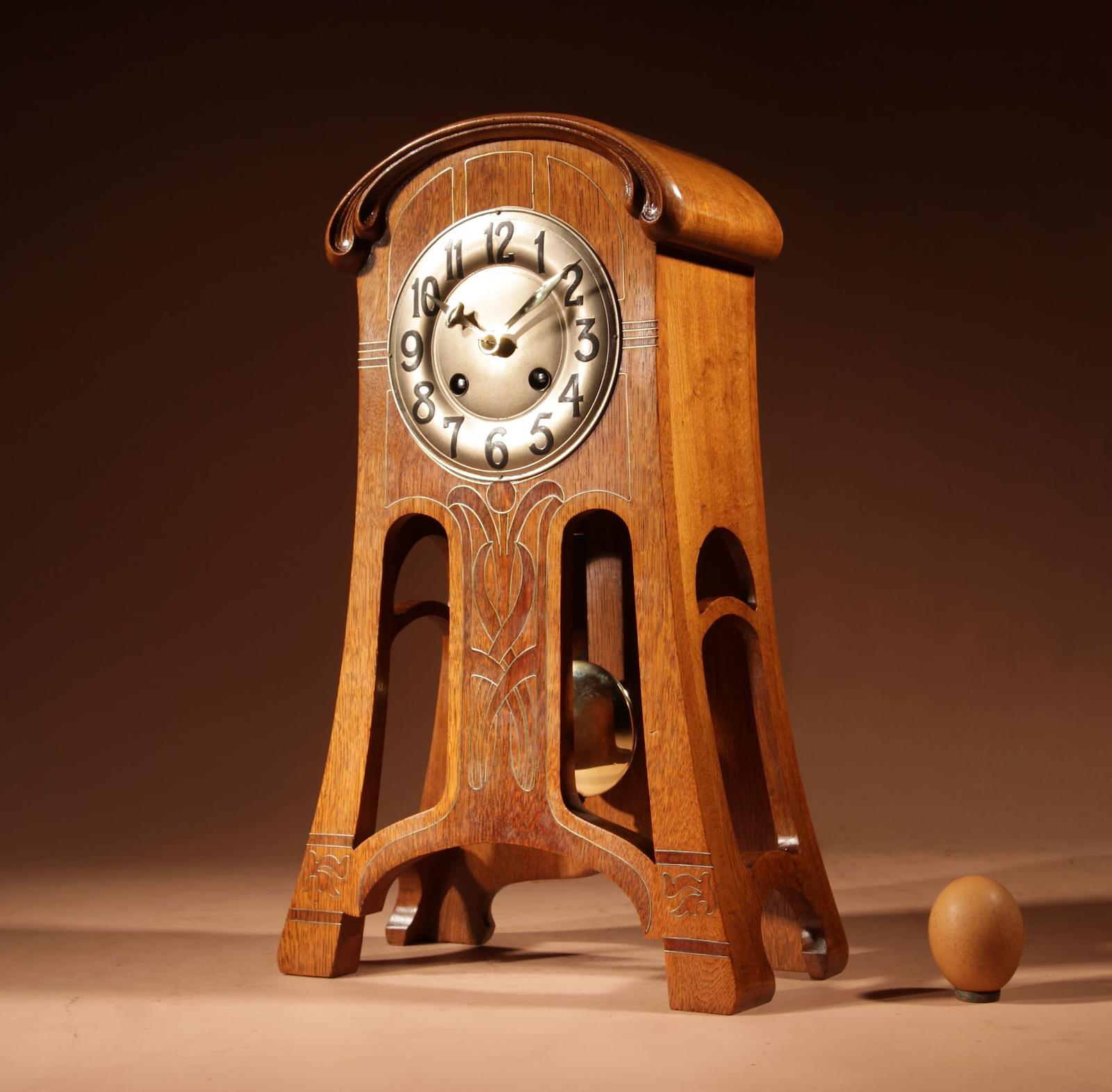Art Nouveau Very Stylish And Elegant Oak Inlaid Mantel Clock Circa 1900