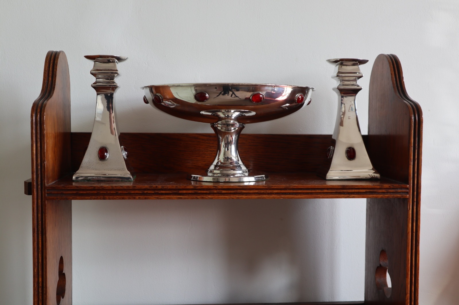 Arts & Crafts / Art Deco, Silver Plated Compote & Candlestick Set with Red Cabochons 1920. (1 of 21)