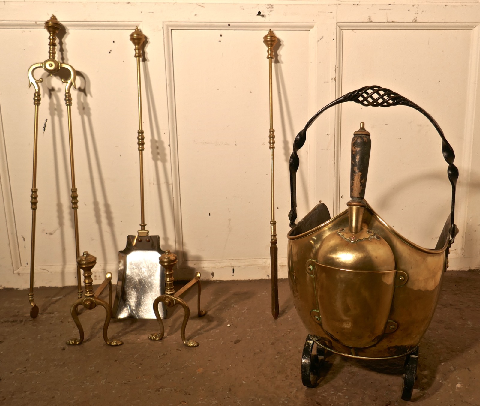 Arts & Crafts Brass Helmet Coal Scuttle & Companion Set