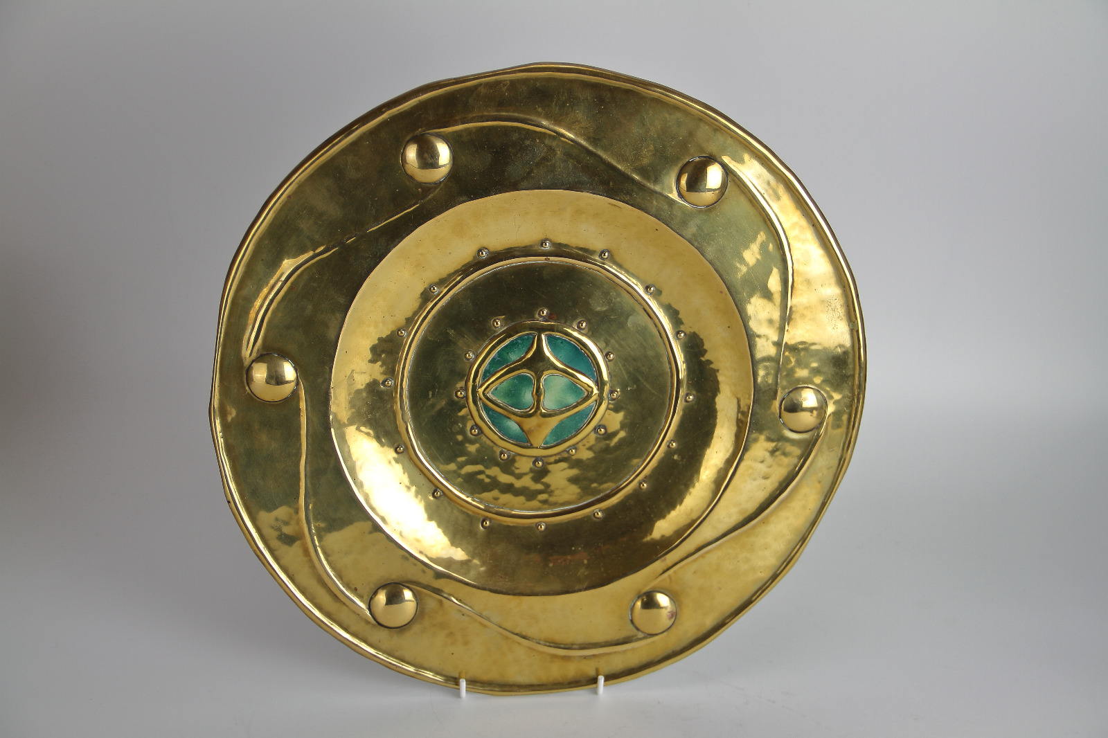 Arts & Crafts Brass Wall Charger with Blue Green Ruskin Ceramic Roundel