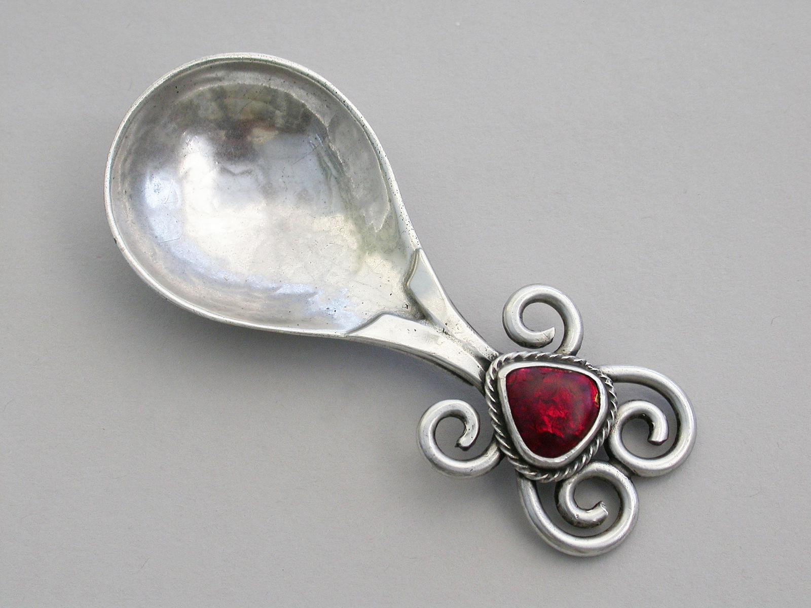 Arts & Crafts Cast Silver Caddy Spoon Red Enamel Cabochon by Omar Ramsden, London 1925