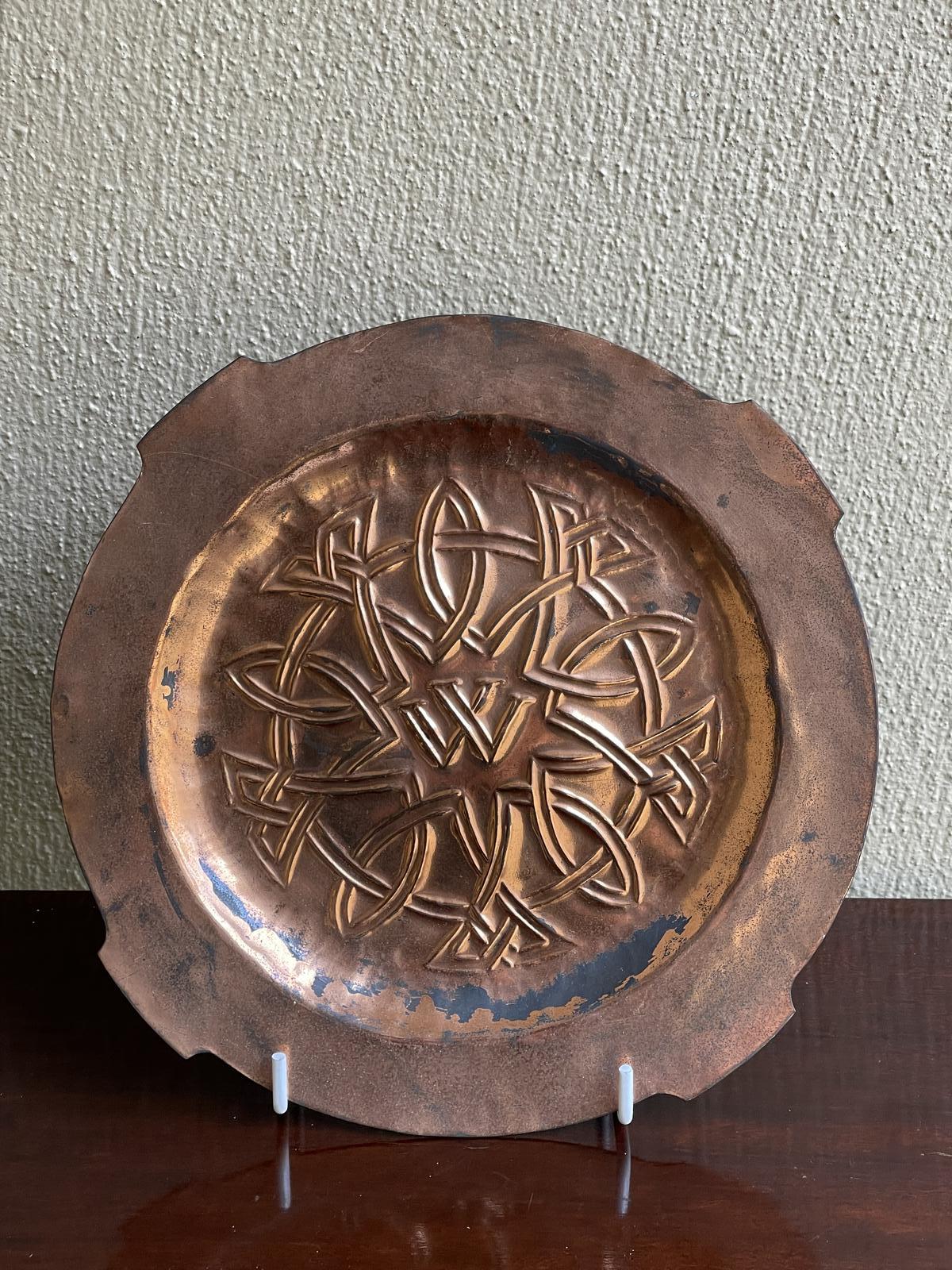 A stylish Arts & Crafts copper plate with wonderful Celtic design with central cartouche initialled W. Stamped with makers mark to reverse.