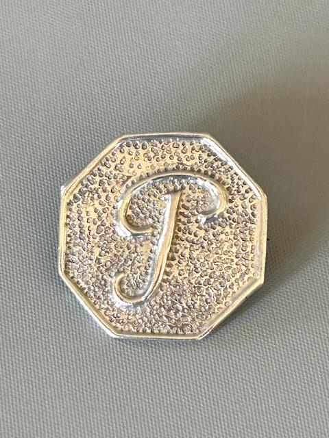 A rare hallmarked silver initial brooch, assayed at the sought after Chester Office. Crafted in the Arts & Crafts taste, the brooch has an octagonal body with a textured finish and the initial P in script. To the reverse, there are a full set of hallmarks and the pin is secured by a 'c' clasp.