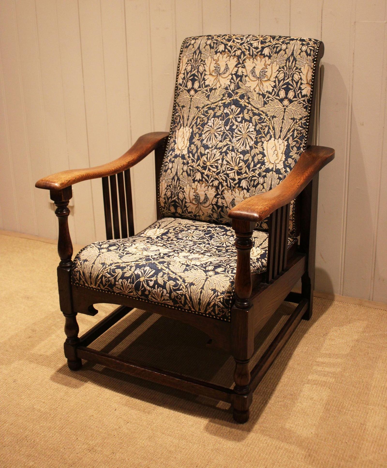Arts & Crafts oak framed recliner chair, the seat leans back and moves forward to a reclining position , held in place by bodyweight , having a newly upholstered seat and back , with side rails , raised on turned supports , newly reupholstered in a William Morris fabric .
