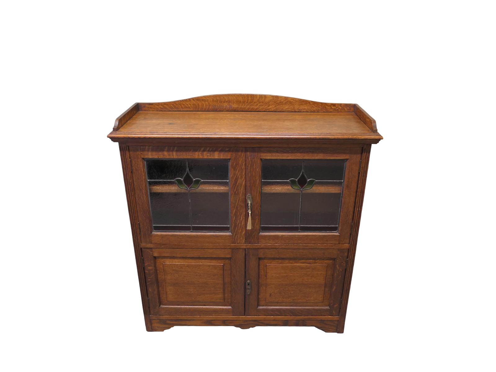 This Arts & Crafts Oak Stained Glass Bookcase is located in United Kingdom