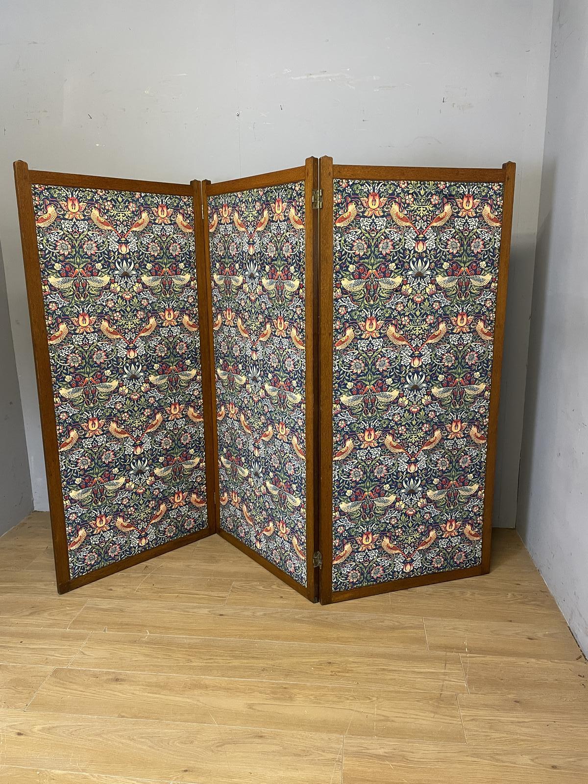 Arts & Crafts Oak Three Panel Screen in William Morris Strawberry Thief Velvet Fabric