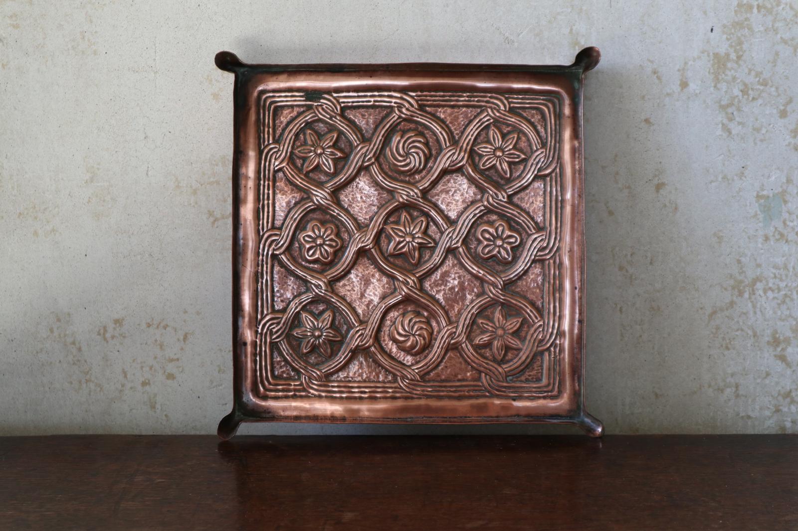 Arts & Crafts Repousse Ropework & Floral Copper Card / Pen Tray c.1900