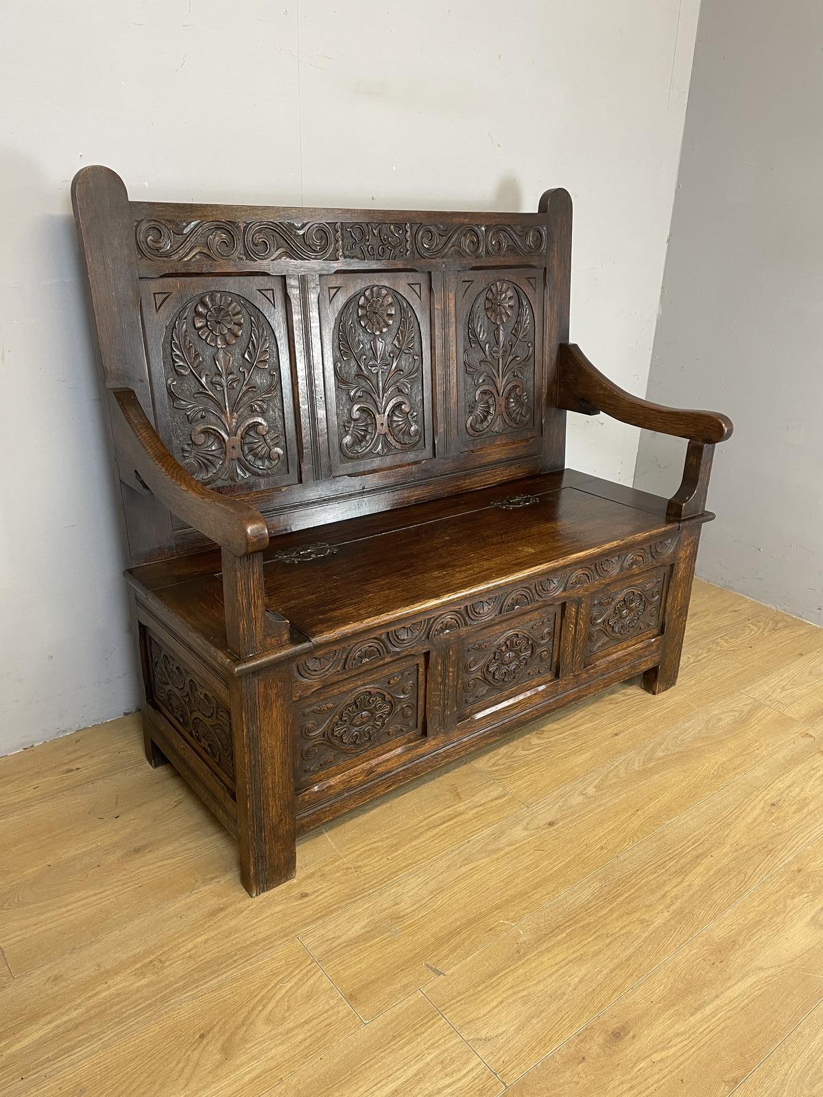 Arts & Crafts Solid Oak Carved Box Settle Dated 1907
