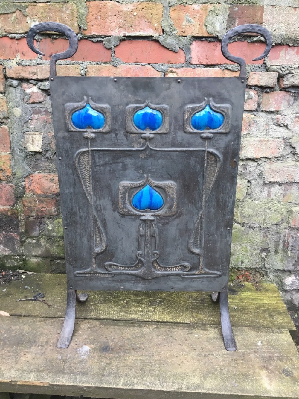 Arts & Crafts Steel Fire Screen with Ceramic Heart Inlays