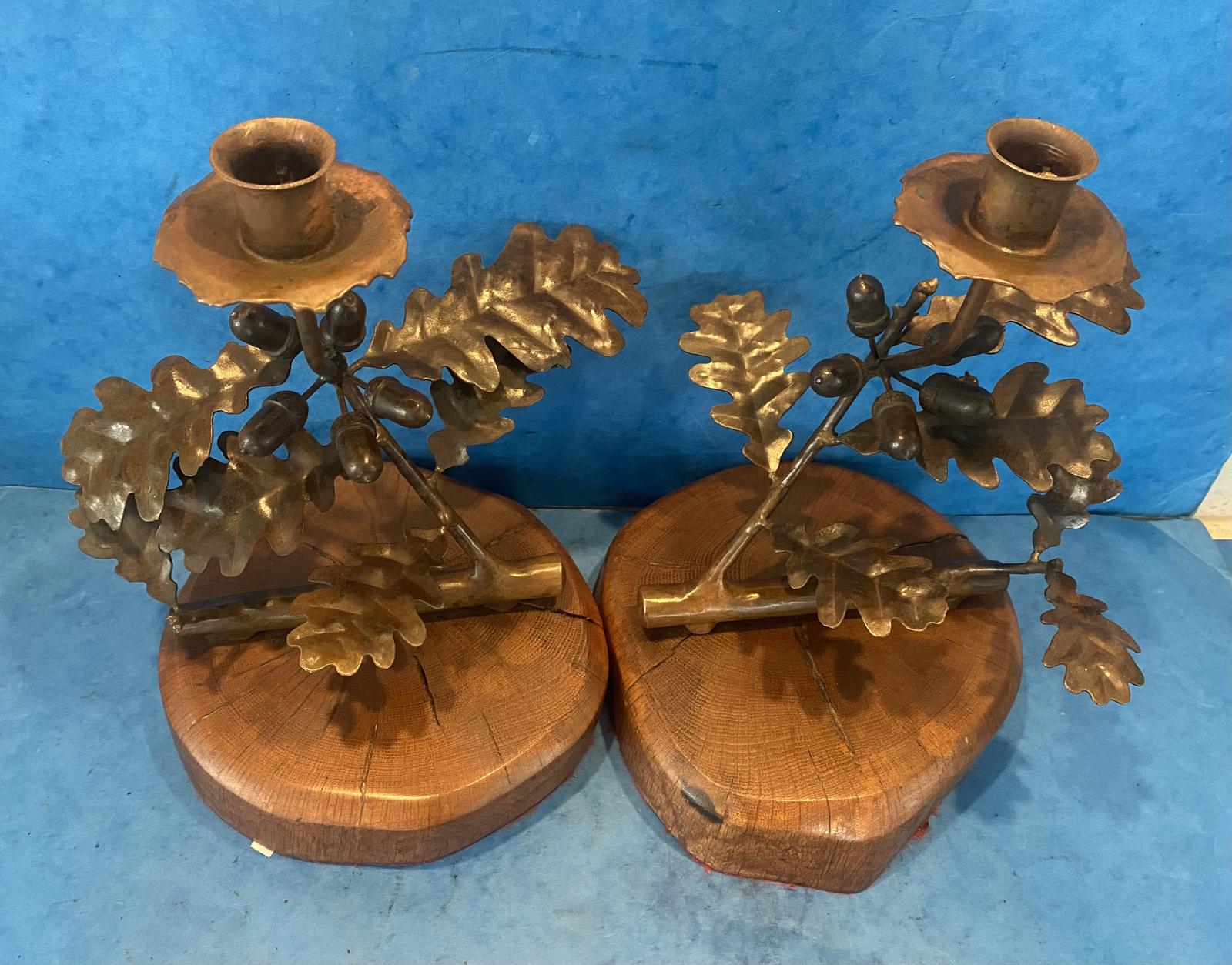 Arts & Crafts Wooden Mounted Bronze Leaf Candlesticks