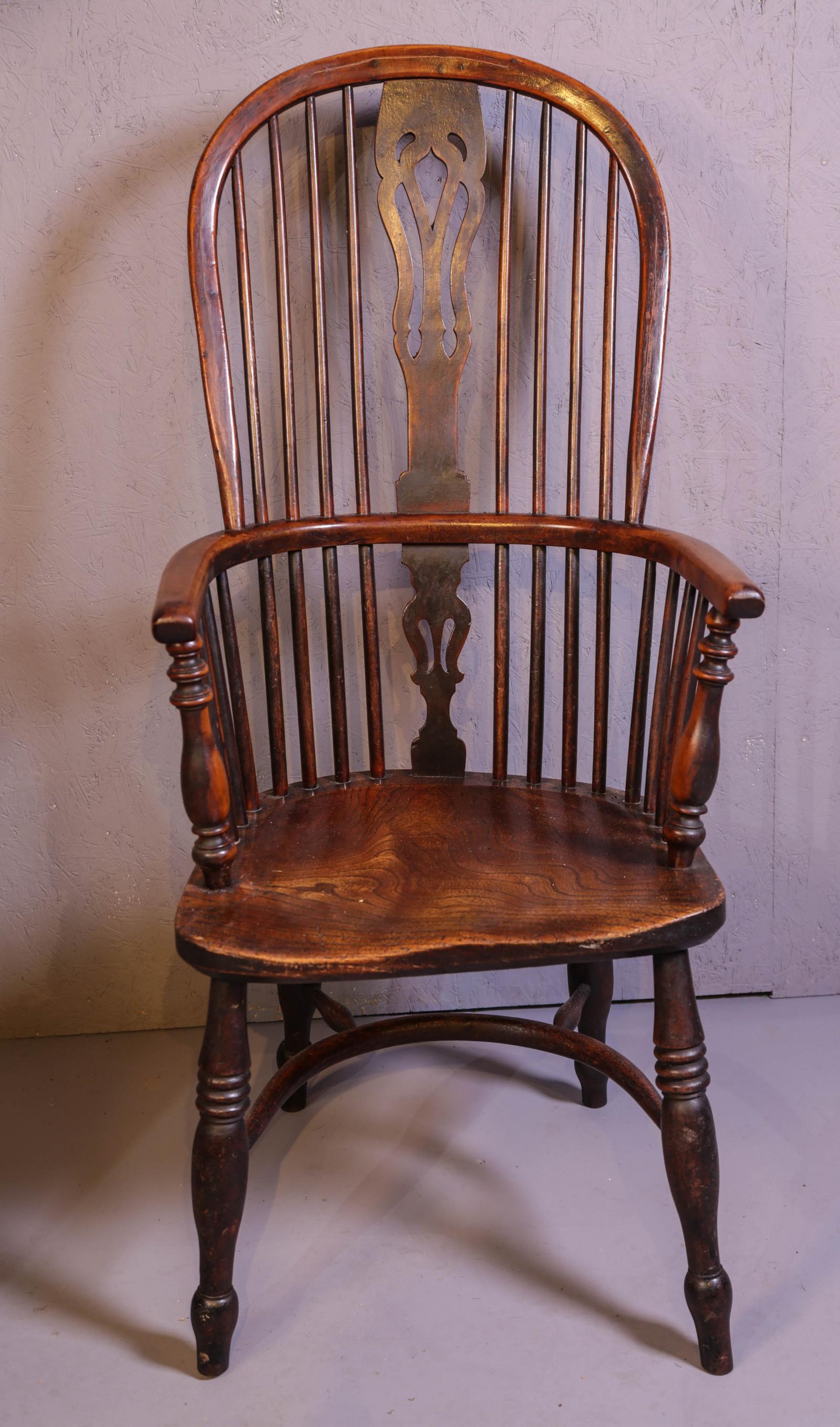 A good high-back Windsor chair in ash with an elm seat, it has a crinoline stretcher and a pierced back splat, this is a Rockley chair probably Fred Walker, it has a pleasing colour and patina, only ever been waxed