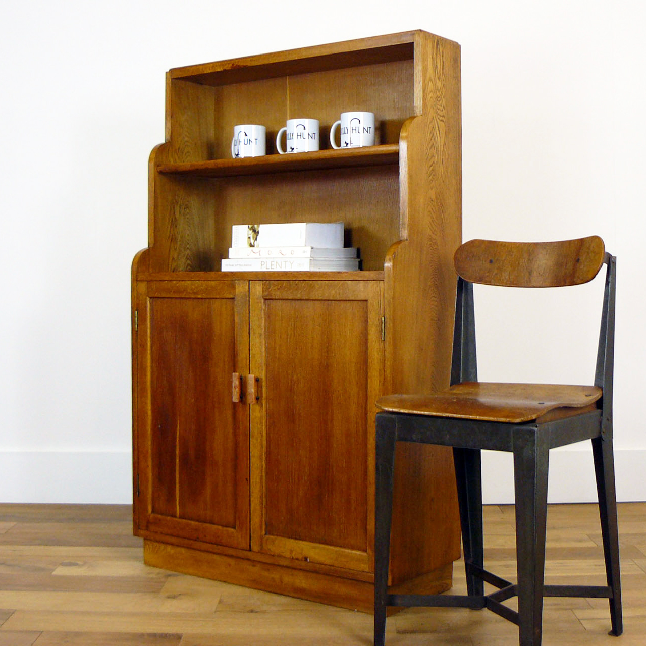 Attractive 1930s English Vintage Oak Cabinet with Waterfall Shelves