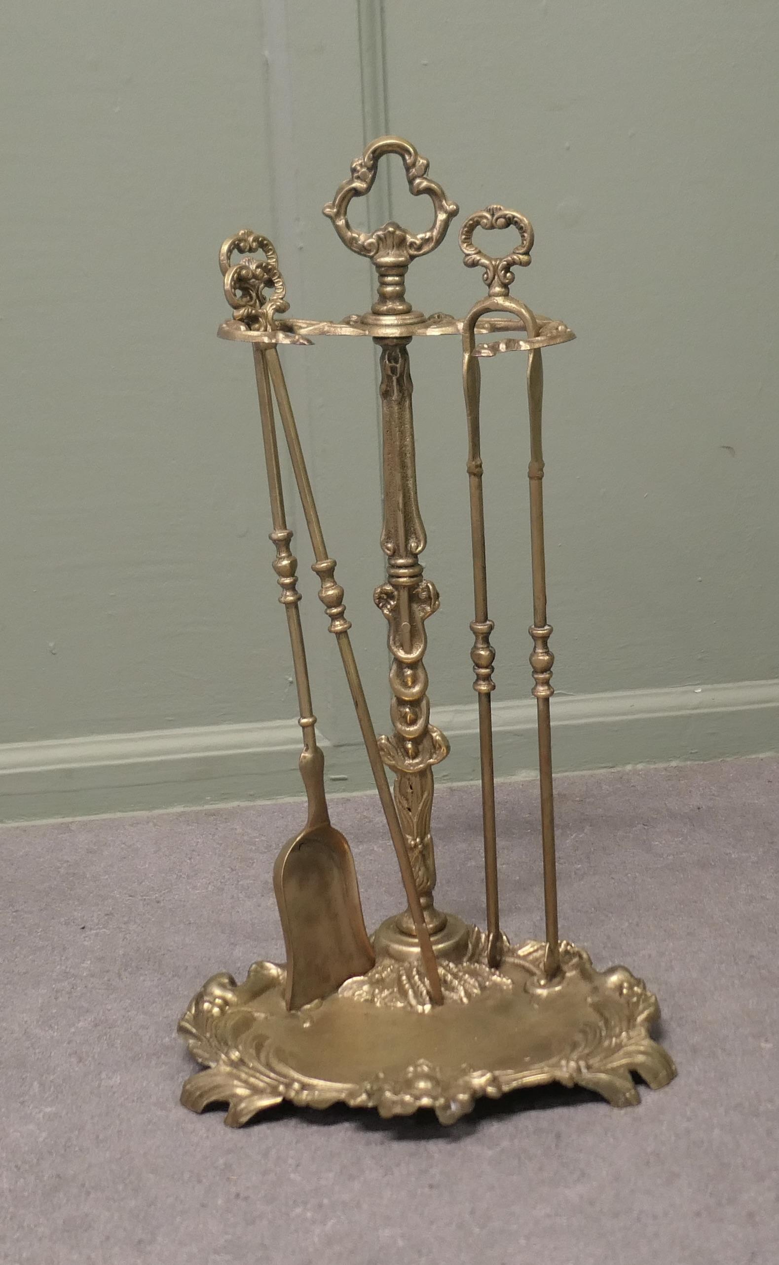 Attractive Brass Rococo Style Fireside Companion Set, Fireside Tools This is a very attractive set on its own stand, shovel, tongs, and poker with wonderful Decorative style to the handles and the base of the stand The stand 22” tall and 12” x 11” DG81