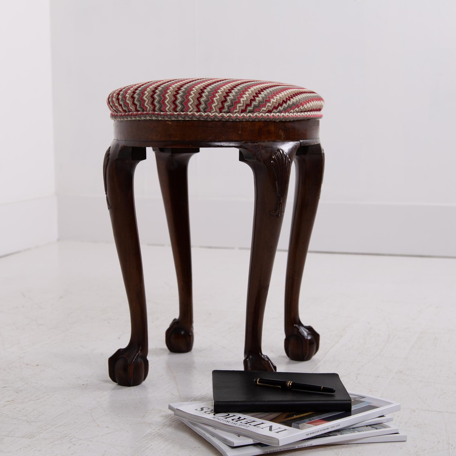 We have a super heavy woven zig zag patterned fabric seat, quite likely Ian Sanderson, which is in a lovely fresh condition framed in quality mahogany on which 4 shell motifeed ball and claw feet are fixed. Condition is good with historic wear with the stool being ready for placing.