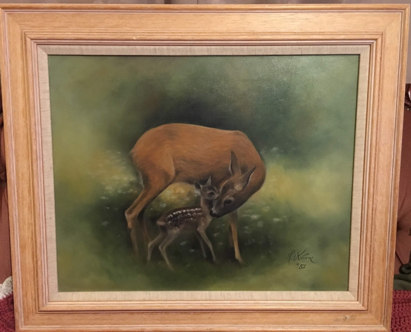 Attractive Original Oil On Canvas Painting “Roe Deer & Fawn” Signed