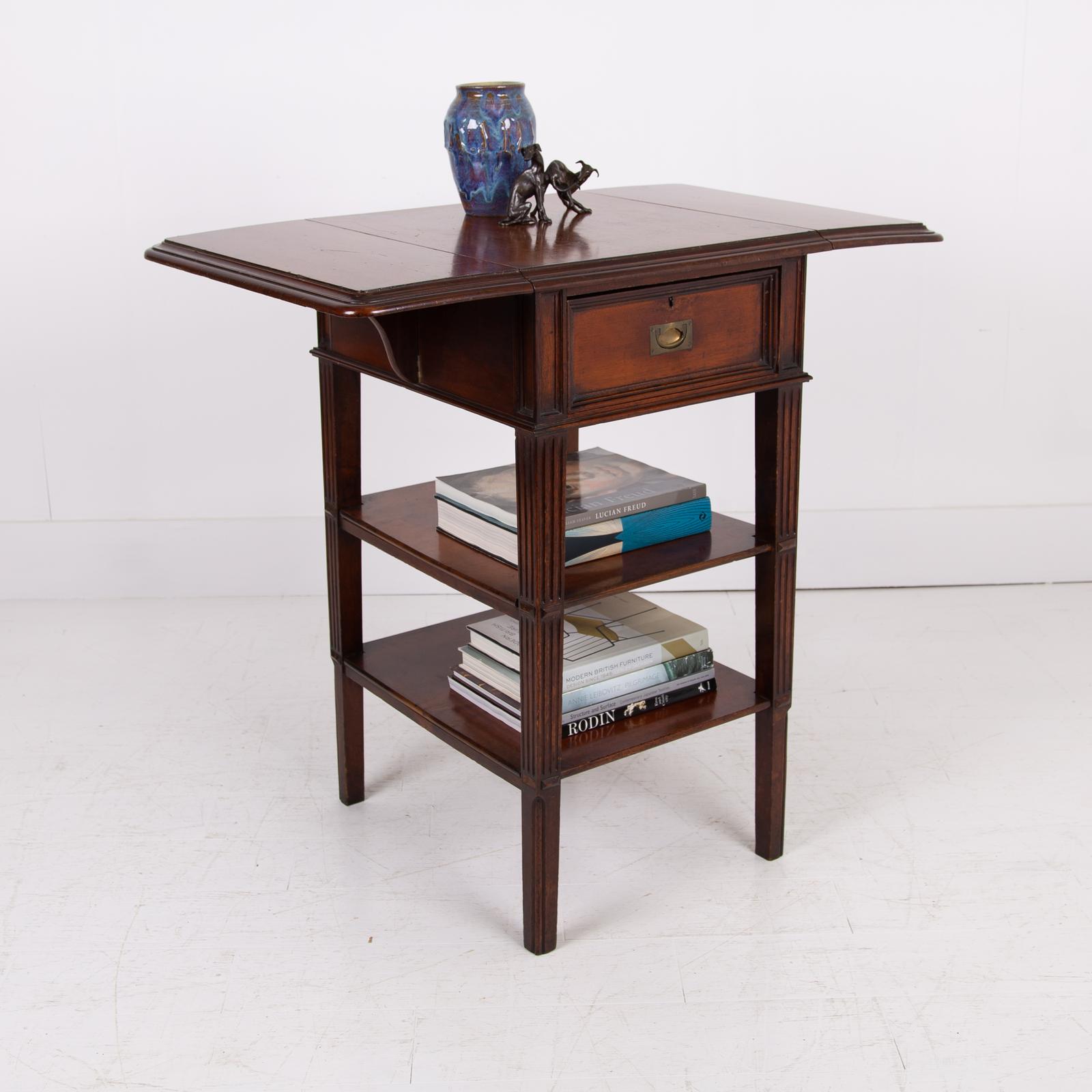 Loving the look, condition and scale on this unusually shaped single drawer side table with 2 lift up/drop down leaves, late Victorian C1880. Leaning towards the Aesthetic Movement in design we have a single drawer opening by way of the charming little brass campaign handle, 2 well edged shelves supported by those rather handsome legs.