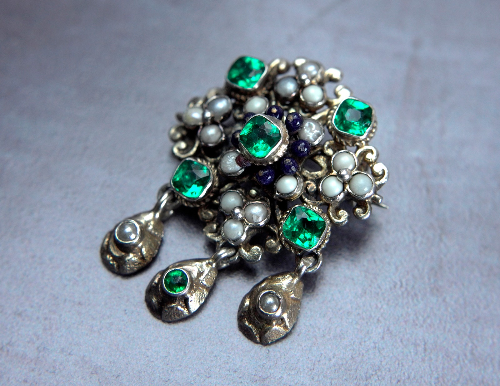 Austro Hungarian Silver Gilt Pearl and Emerald Paste Brooch, From Budapest, Stamped Kt