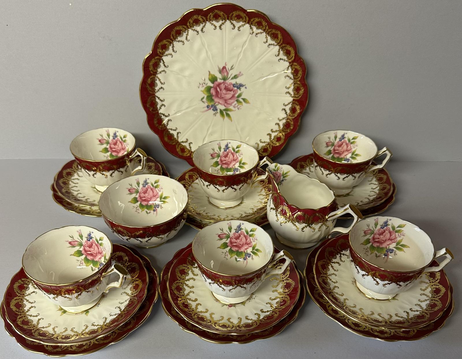 Aynsley Maroon Floral Crocus Shape 21 Piece Tea Set
