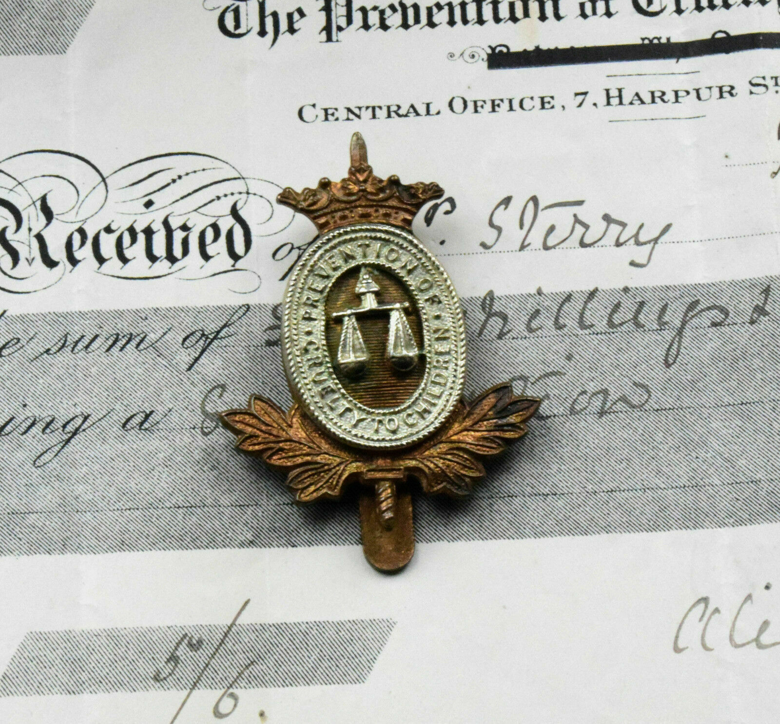Badge of the Prevention of Cruelty to Children & Receipt Dated 1907