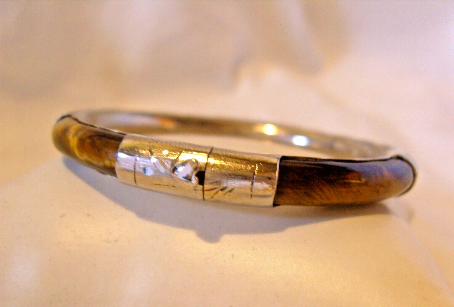 Bangle Silver & Tigers Eye 1970s Vintage Ornate Bracelet 7" Length 25.7 Grams
