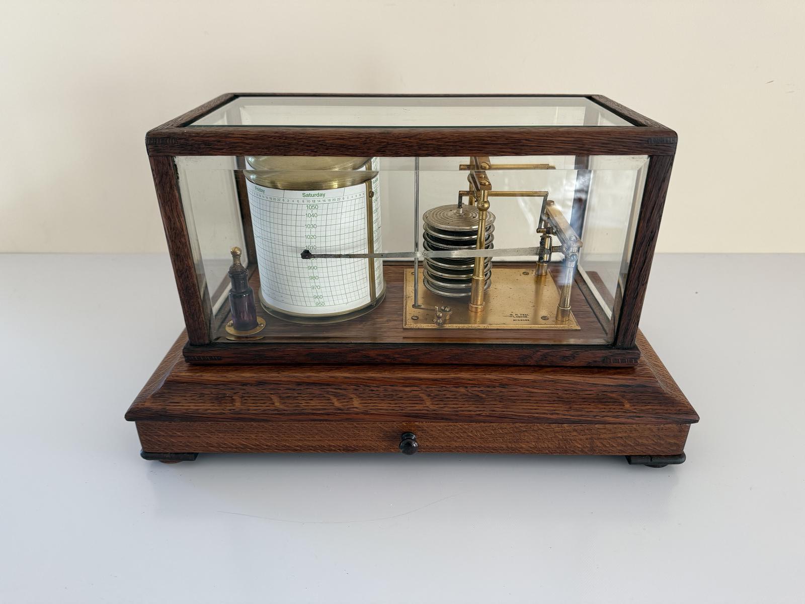 This is a mid-20th century display barograph signed G. H. Zeal of London with serial number H 3036. As a testament to their quality products, the company is still trading today and specialise in all types of thermometers for commercial use - medical, laboratory, industrial, as well as meteorological. This instrument bears all the hallmarks of being manufactured by Short & Mason with whom they had a long-standing trading relationship. This barograph has bevelled glass to the lift-off lid, a two-compartment chart drawer to the base and has its original glass ink bottle and dipper. The mid-oak case has been carefully stripped and re-polished to a high standard. The weekly clock and the lacquered brass barograph movement are both in good working condition.