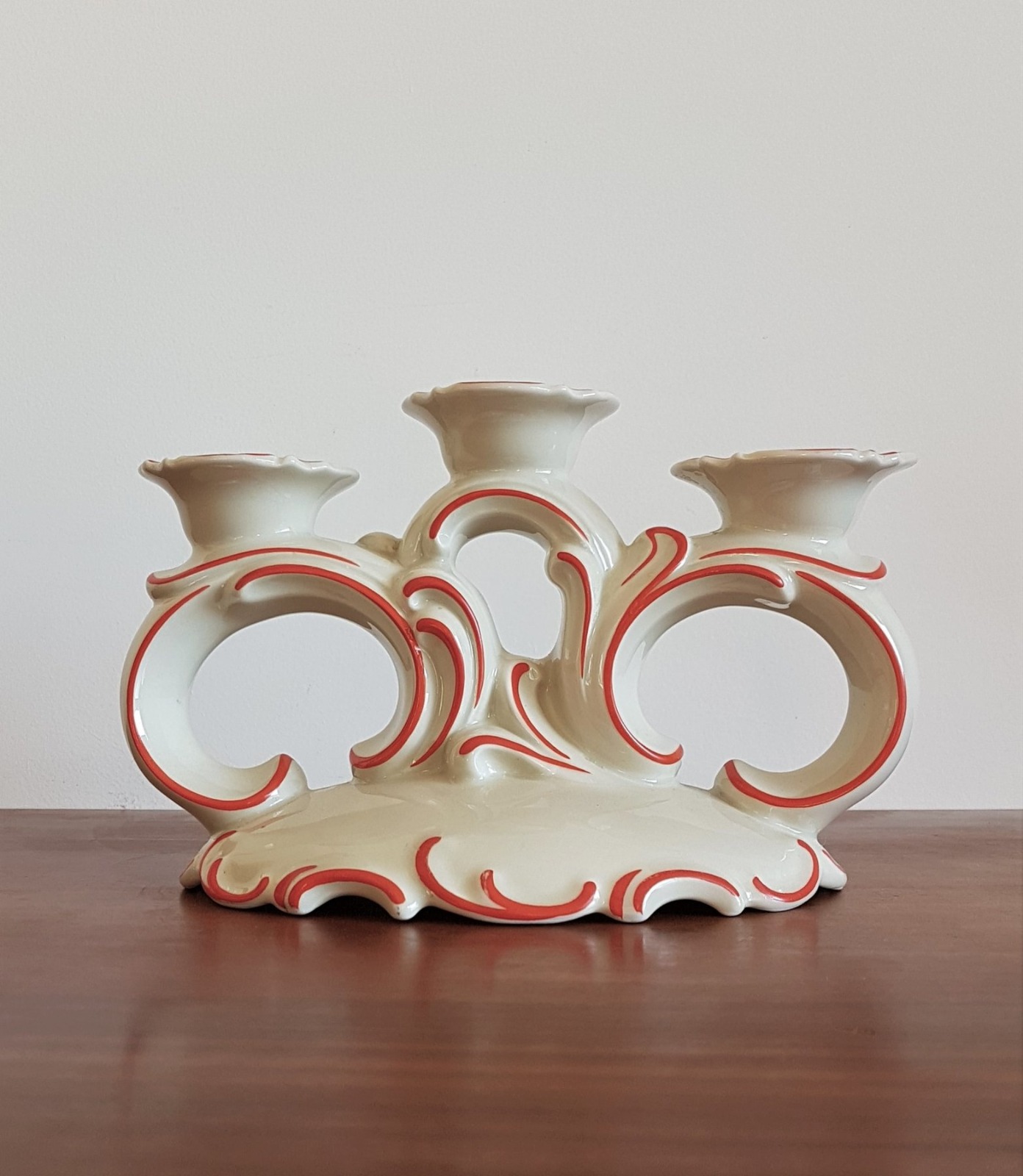 Bavarian Moschendorf Art Deco Dove White & Red Porcelain Candelabra / Candleholder