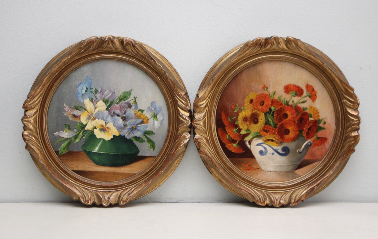 Beaufils, Pair of Floral Oil Paintings on Wooden Board in Gilt Frames