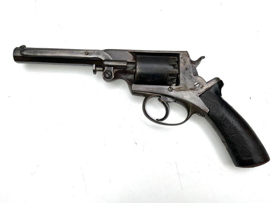This revolver was used extensively during the late Victorian period, was never a display item, the grips are showing much wear as is the revolver, the actions as it should be cocks, and fires also with trigger action too, has the safety catch that works the lettering along barrel and above triggers well-worn and difficult now to decipher. On 20 February 1856, Lieutenant Frederick E. B. Beaumont of the Royal Engineers was granted a British patent for improvements to the Adams revolver which allowed them to be cocked and fired either by manually cocking the hammer as in single-action revolvers or by just pulling the trigger. Length 11.25 in. (286 mm) Calibre .442 in (11.2 mm) (54-bore) Comes in the retailers box length of which is 41 cm depth 18 cm heights 8 cm comes with key retailers names James Kerr & Co London Armoury. Offering free UK delivery reference DBSS. Tel: +44 7505 165 843 We accept online payments for all our items listed: Bank transfer cash on collection or if wishing over the phone using your debit or credit cards, also doing lay-by payments plan, or email giving your address details & contact number and we shall send you your items invoice to make payment with your card. Send your request to - john.strong2@gmail.com