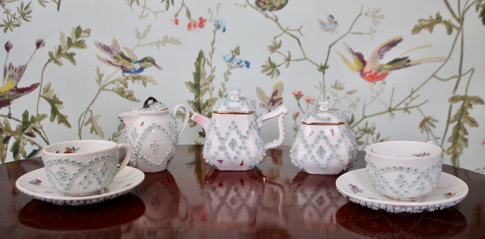 Beautiful Antique 19th Century Miniature Toy Tea Set, Applied Flowers, Butterflies