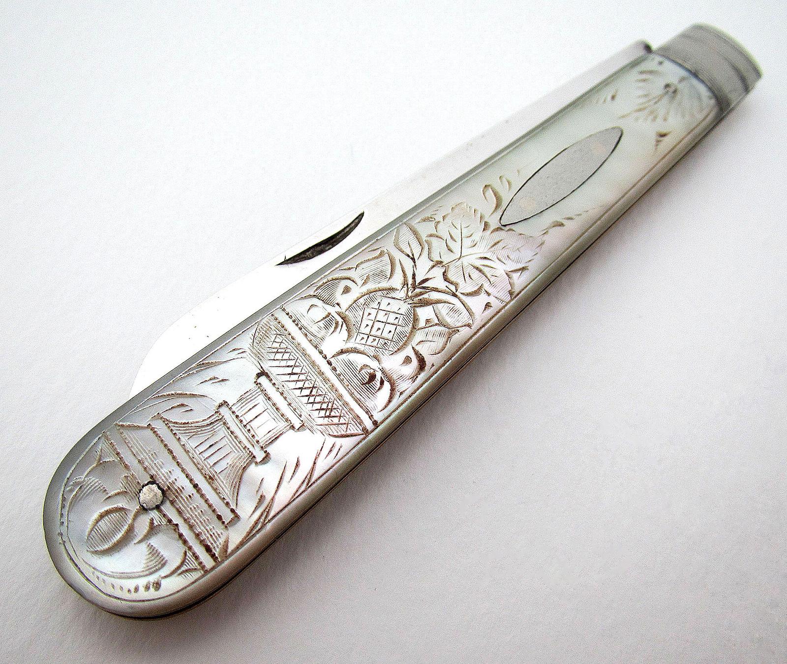 Beautiful Antique Sheffield Sterling Silver & Hand-carved Mother of Pearl Large Fruit Knife
