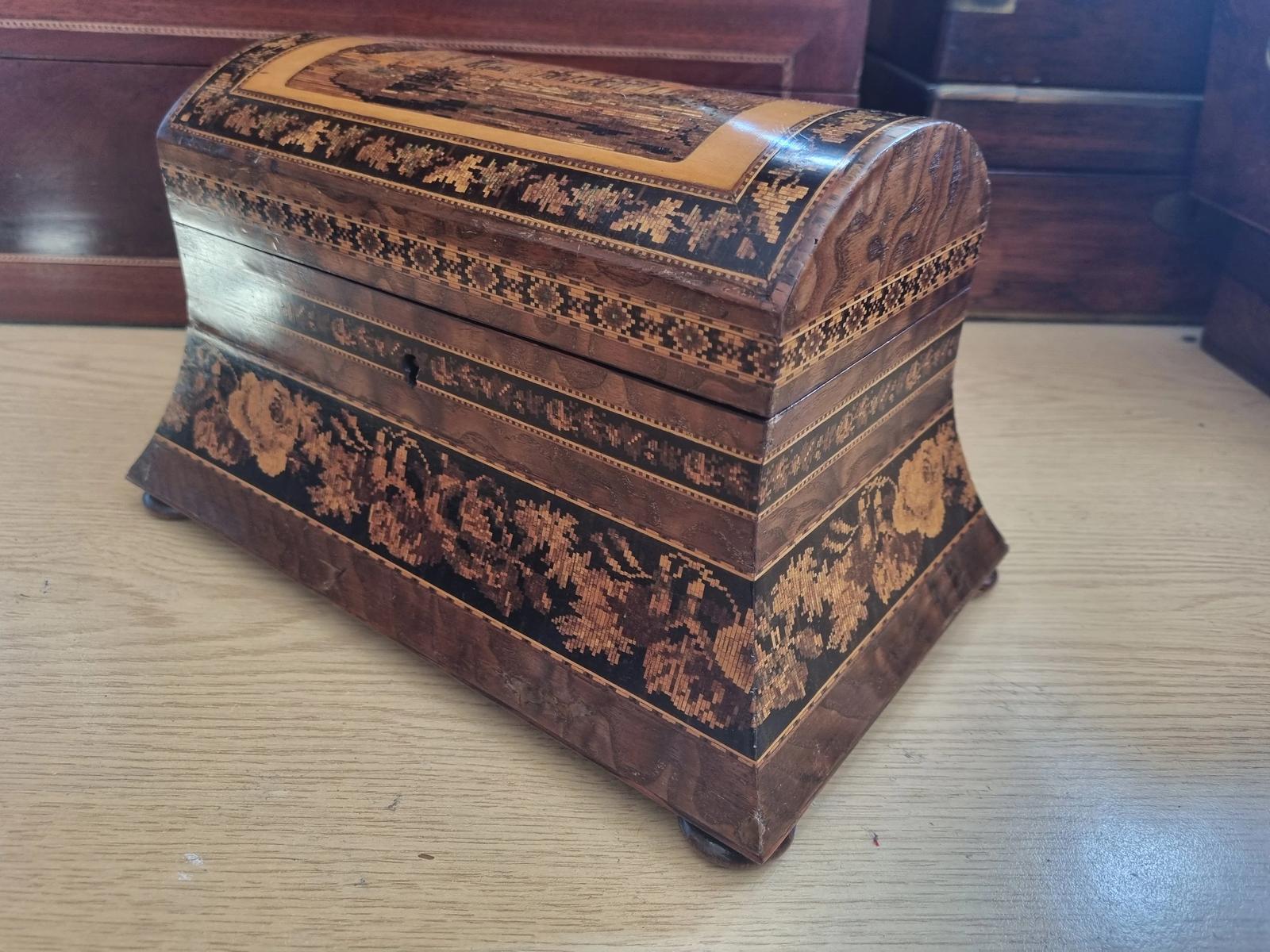 Beautiful Antique Tunbridge Ware Tea Caddy with Castle Top in Excellent Original Condition