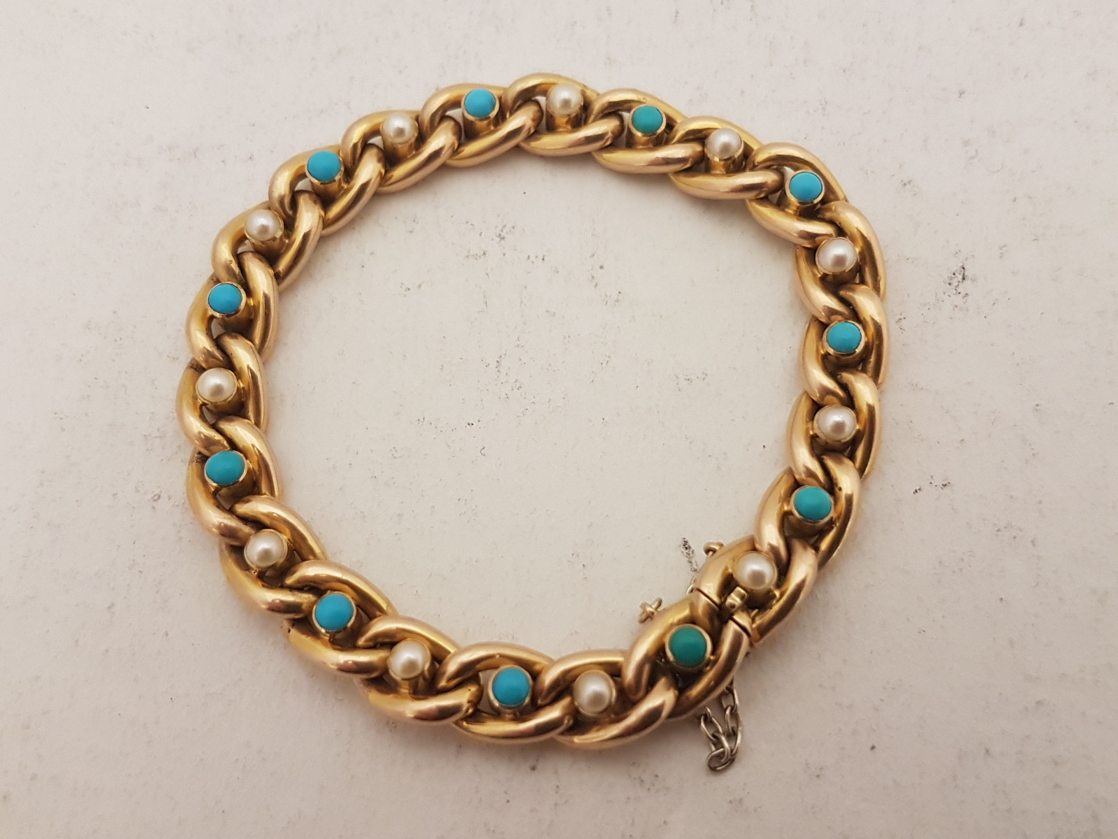Beautiful Antique Victorian 15ct Yellow Gold Pearl and Turquoise Bracelet