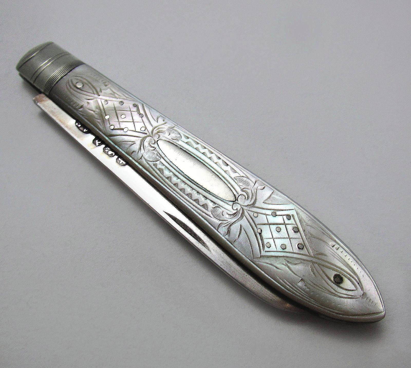 Beautiful Antique Victorian 1896 Sterling Silver Hand-Carved Mother of Pearl Fruit Knife, Arthur Worral Staniforth, Sheffield
