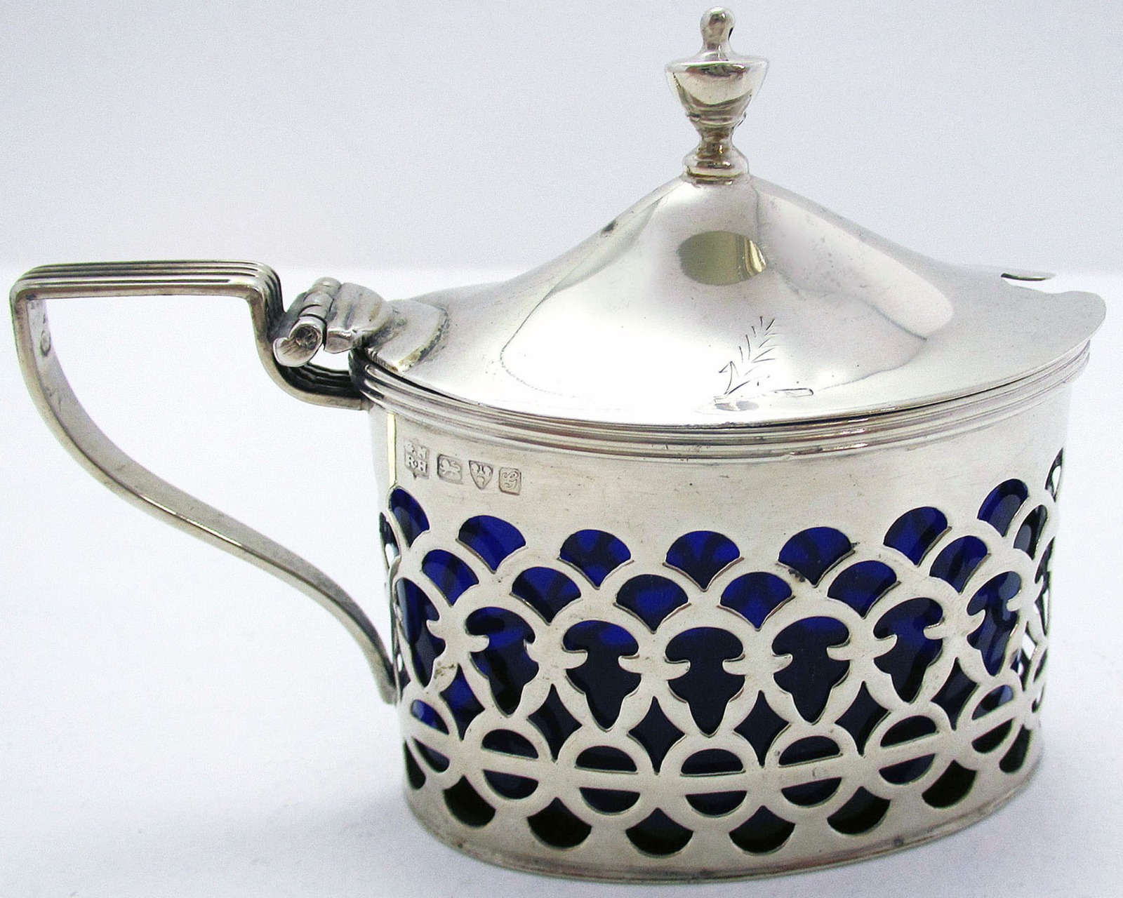 Beautiful Chester Pierced Solid Sterling Silver & Bristol Blue Glass Liner Antique Mustard Pot Cruet, Edwardian English 1907 Hallmarked (1 of 1)