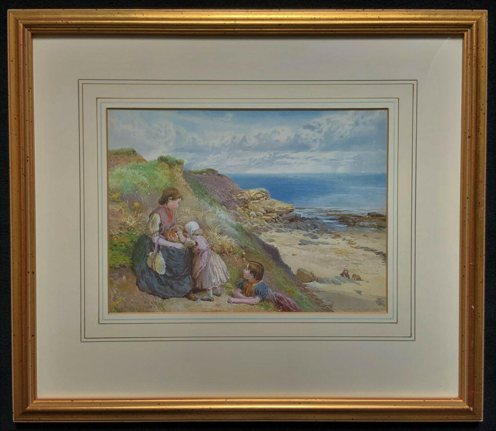 Beautiful Exhibited 19th Century Print of Mother with 2 Children on Beach