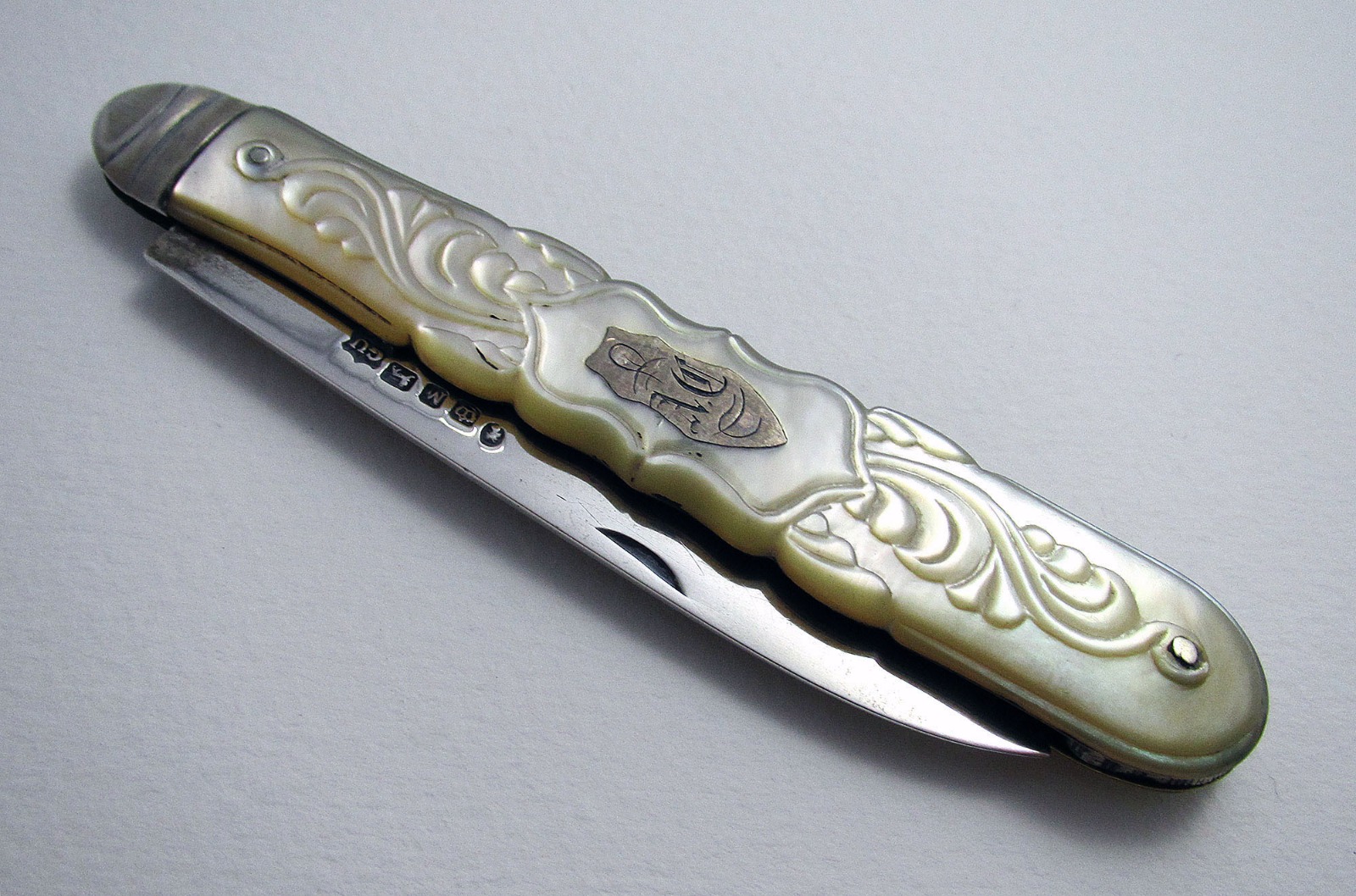 Beautiful Large Victorian 1855 Solid Sterling Silver & Mother of Pearl Mop Antique English Sheffield Folding Pocket Fruit Penknife